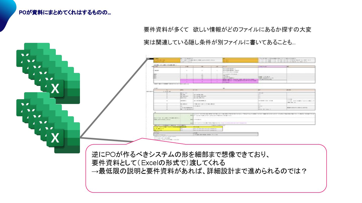 要件資料が多くて 欲しい情報がど ファイルにあるか探す 大変 実 関連している隠し条件が別ファイルに書いてあることも... 逆にPOが作るべきシステム 形を細部まで想像できており、 要件資料として(Excel 形式で)渡してくれる →最低限 説明と要件資料があれ 、詳細設計まで進められる で ?