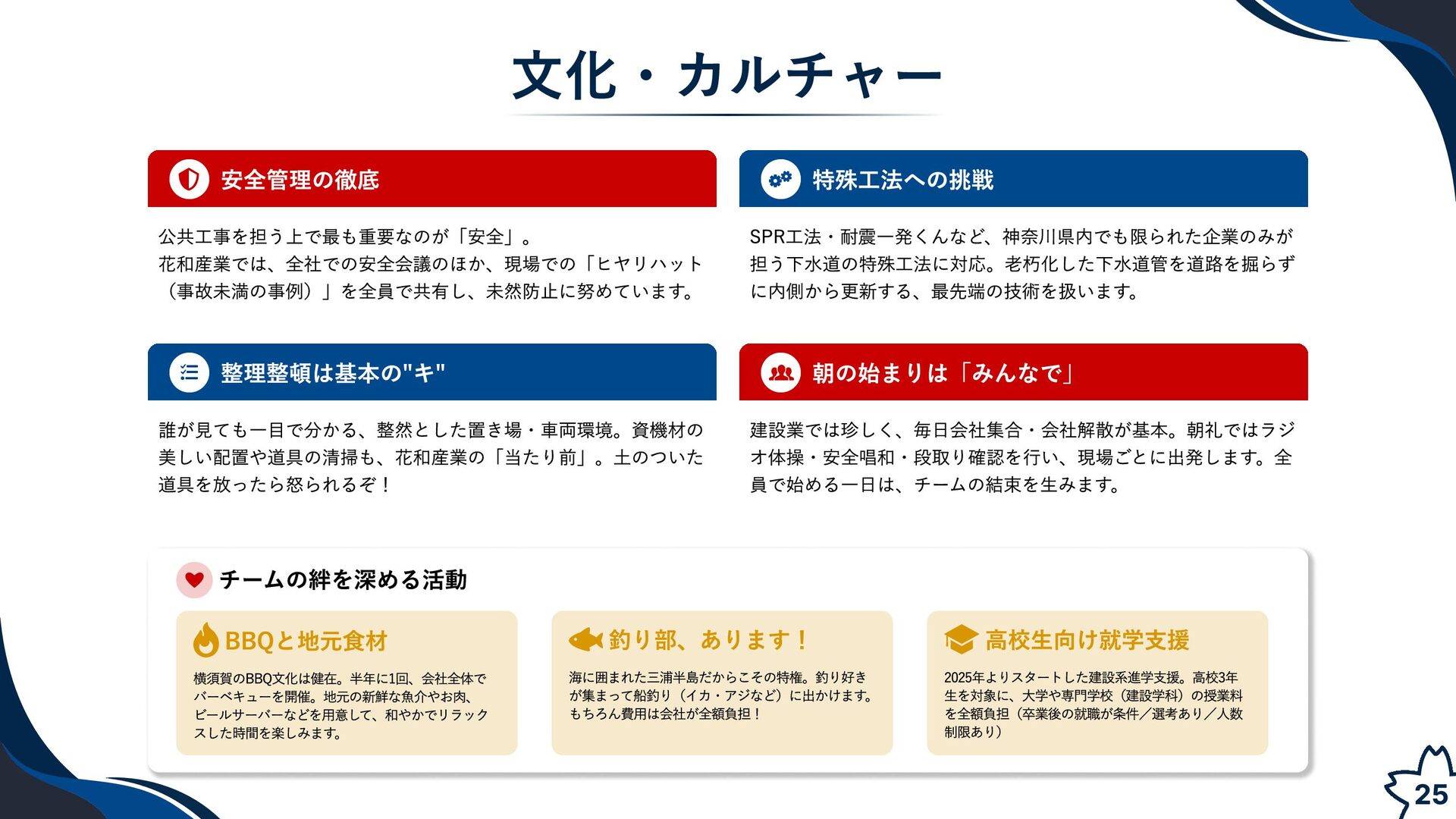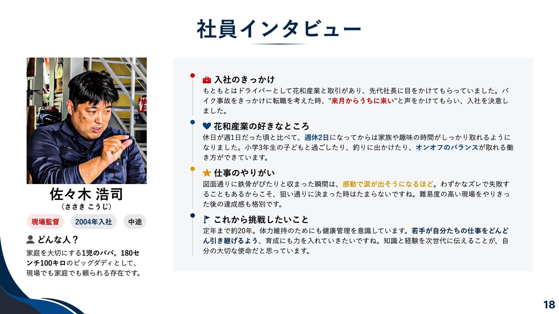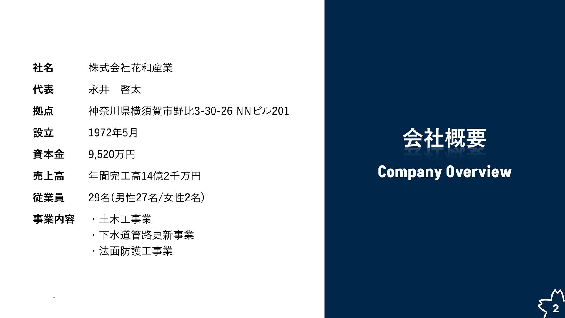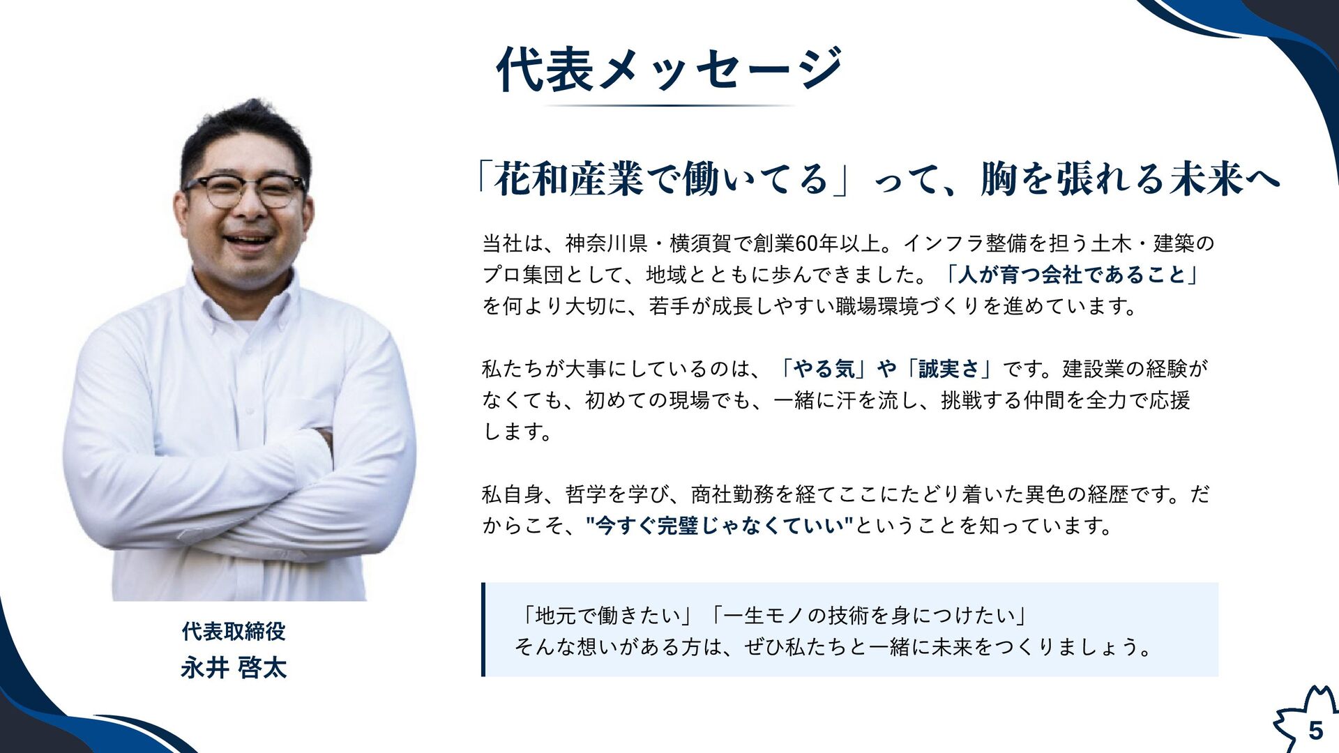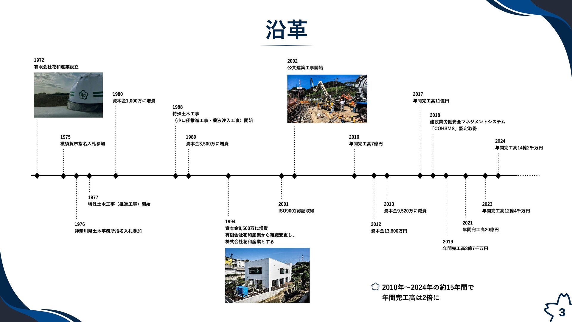 1988 特殊土木工事 (小口径推進工事・薬液注入工事)開始 1989 資本金3,500万に増資 1994 資本金8,500万に増資 有限会社花和産業から組織変更し、 株式会社花和産業とする 2001 ISO9001認証取得 2002 公共建築工事開始 2010 年間完工高7億円 2012 資本金13,600万円 2013 資本金9,520万に減資 2017 年間完工高11億円 2018 建設業労働安全マネジメントシステム 「COHSMS」認定取得 2019 年間完工高8億7千万円 2021 年間完工高20億円 2023 年間完工高12億 4 千万円 2024 年間完工高1 4 億2千万円 2010年 ~ 202 4 年 の約 15年間 で 年間完工高 は 2 倍 に 沿革 3