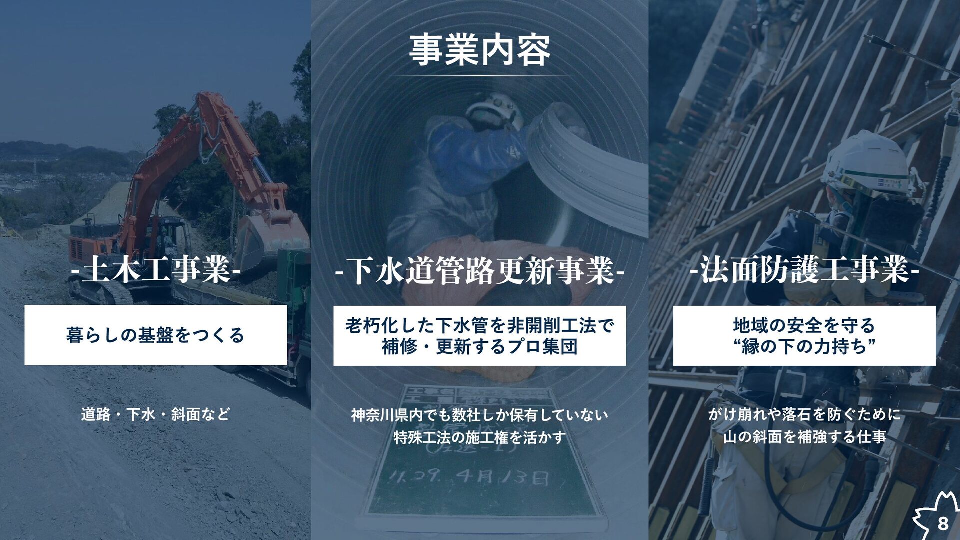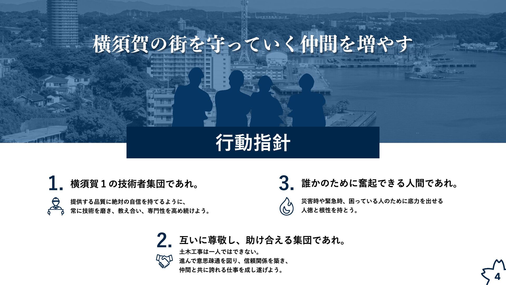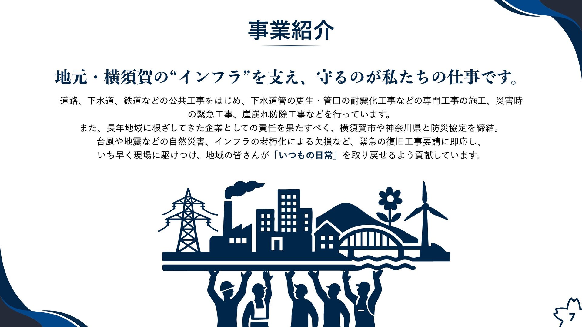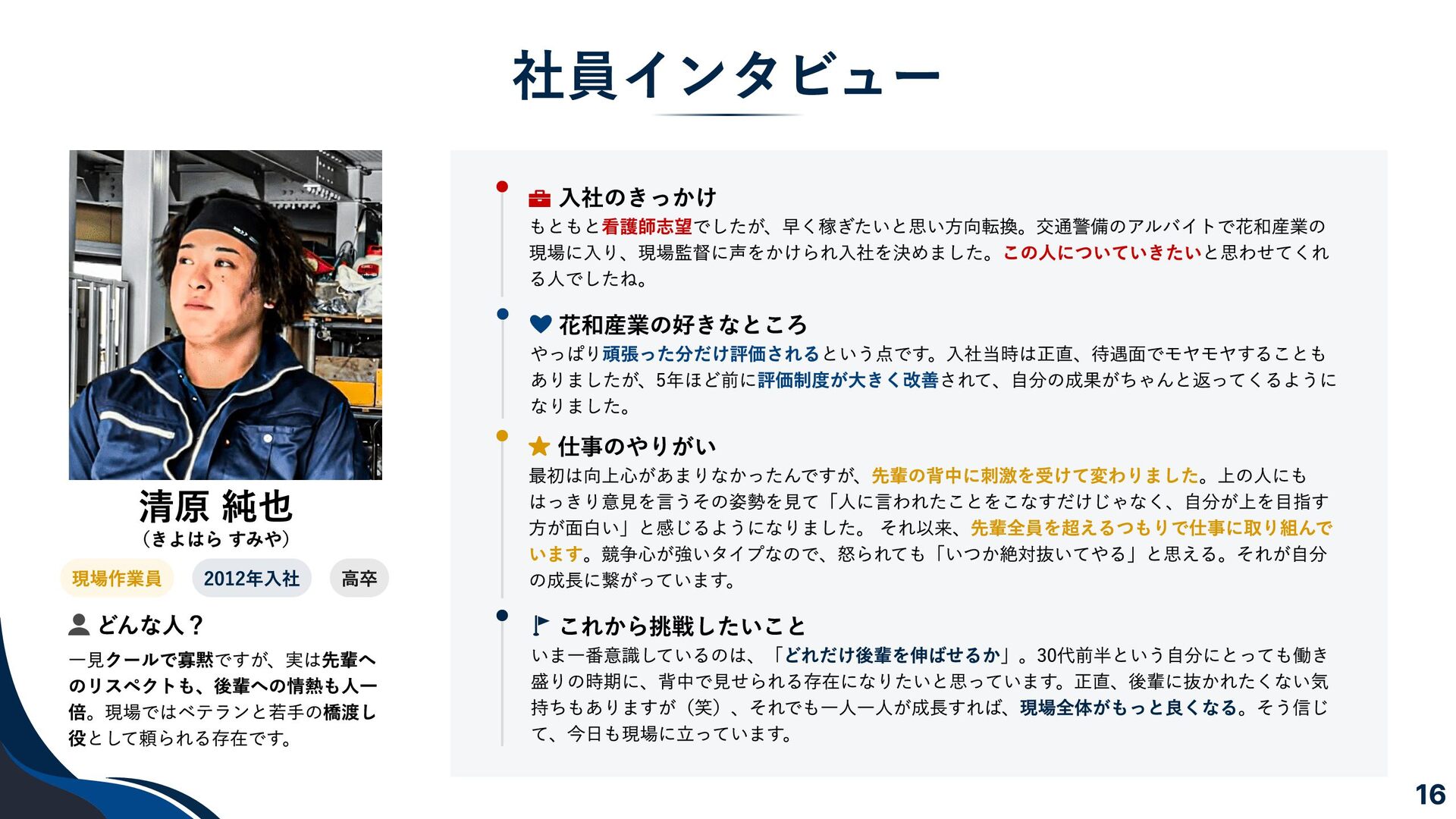 1988 特殊土木工事 (小口径推進工事・薬液注入工事)開始 1989 資本金3,500万に増資 1994 資本金8,500万に増資 有限会社花和産業から組織変更し、 株式会社花和産業とする 2001 ISO9001認証取得 2002 公共建築工事開始 2010 年間完工高7億円 2012 資本金13,600万円 2013 資本金9,520万に減資 2017 年間完工高11億円 2018 建設業労働安全マネジメントシステム 「COHSMS」認定取得 2019 年間完工高8億7千万円 2021 年間完工高20億円 2023 年間完工高12億 4 千万円 2024 年間完工高1 4 億2千万円 2010年 ~ 202 4 年 の約 15年間 で 年間完工高 は 2 倍 に 沿革 3