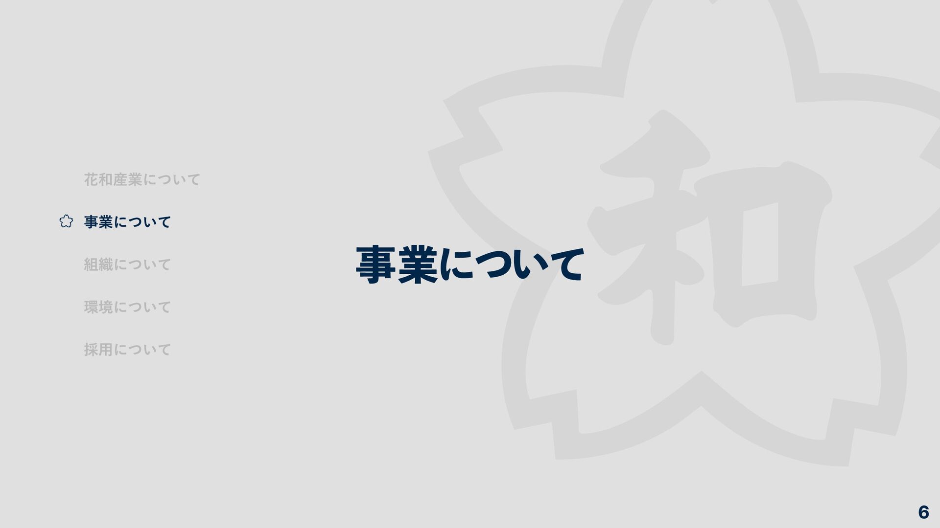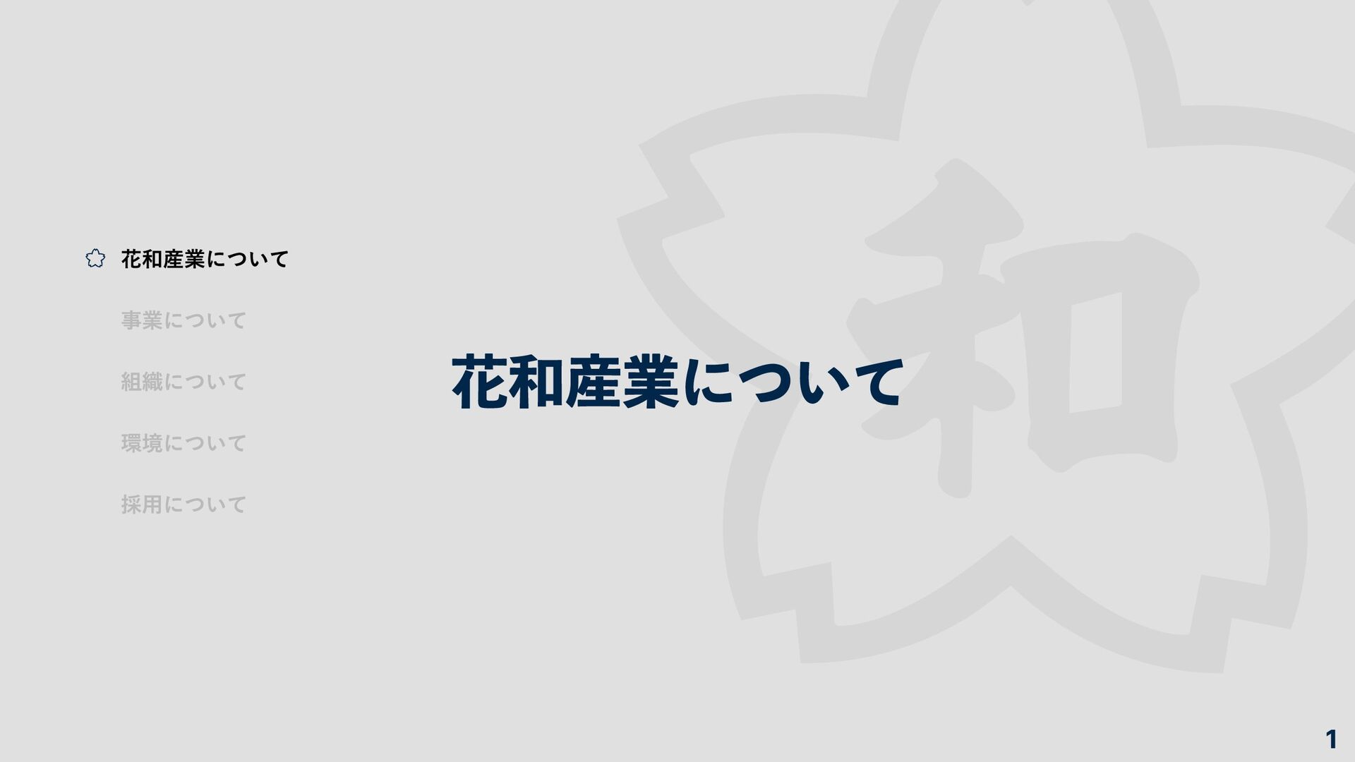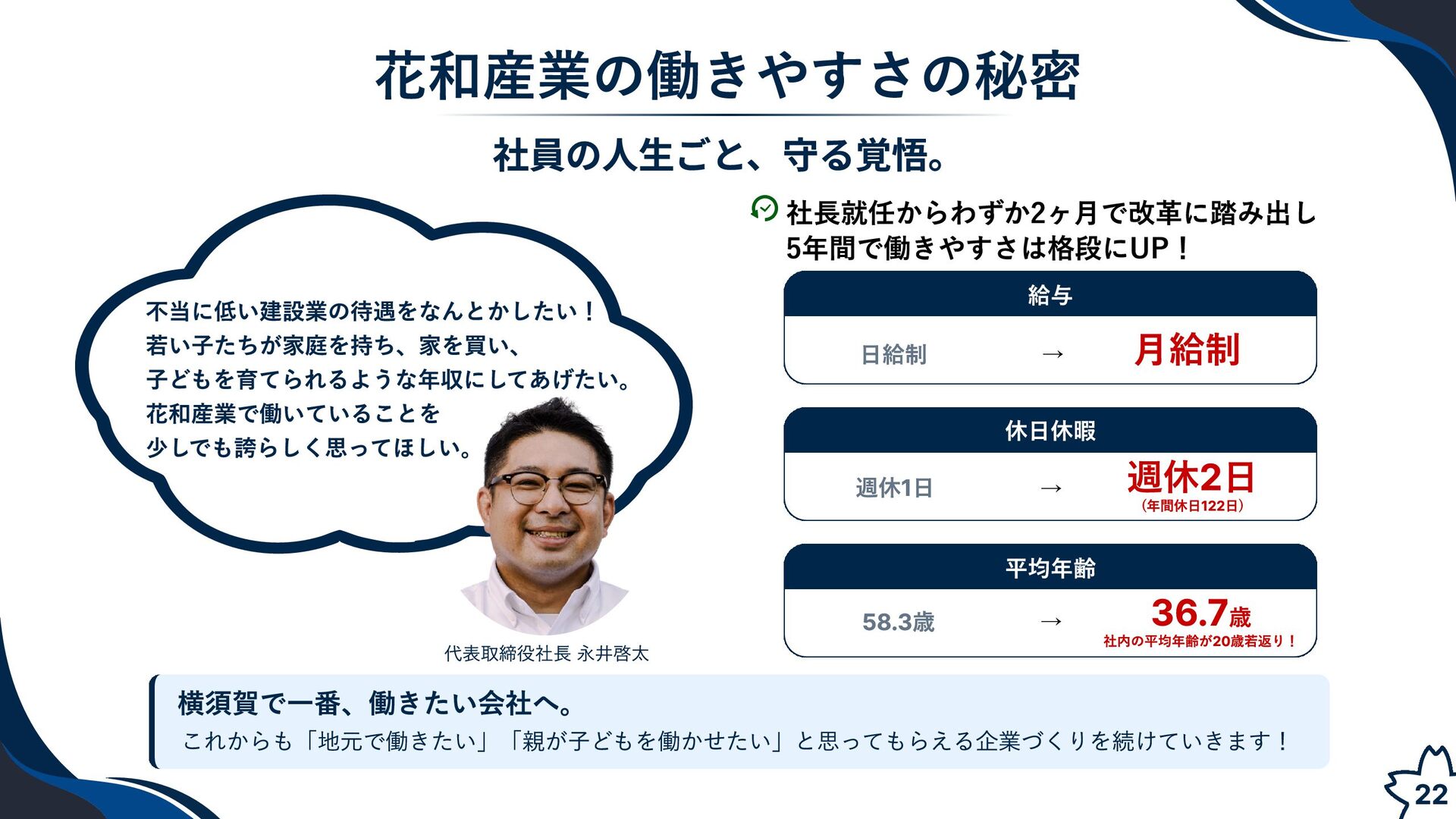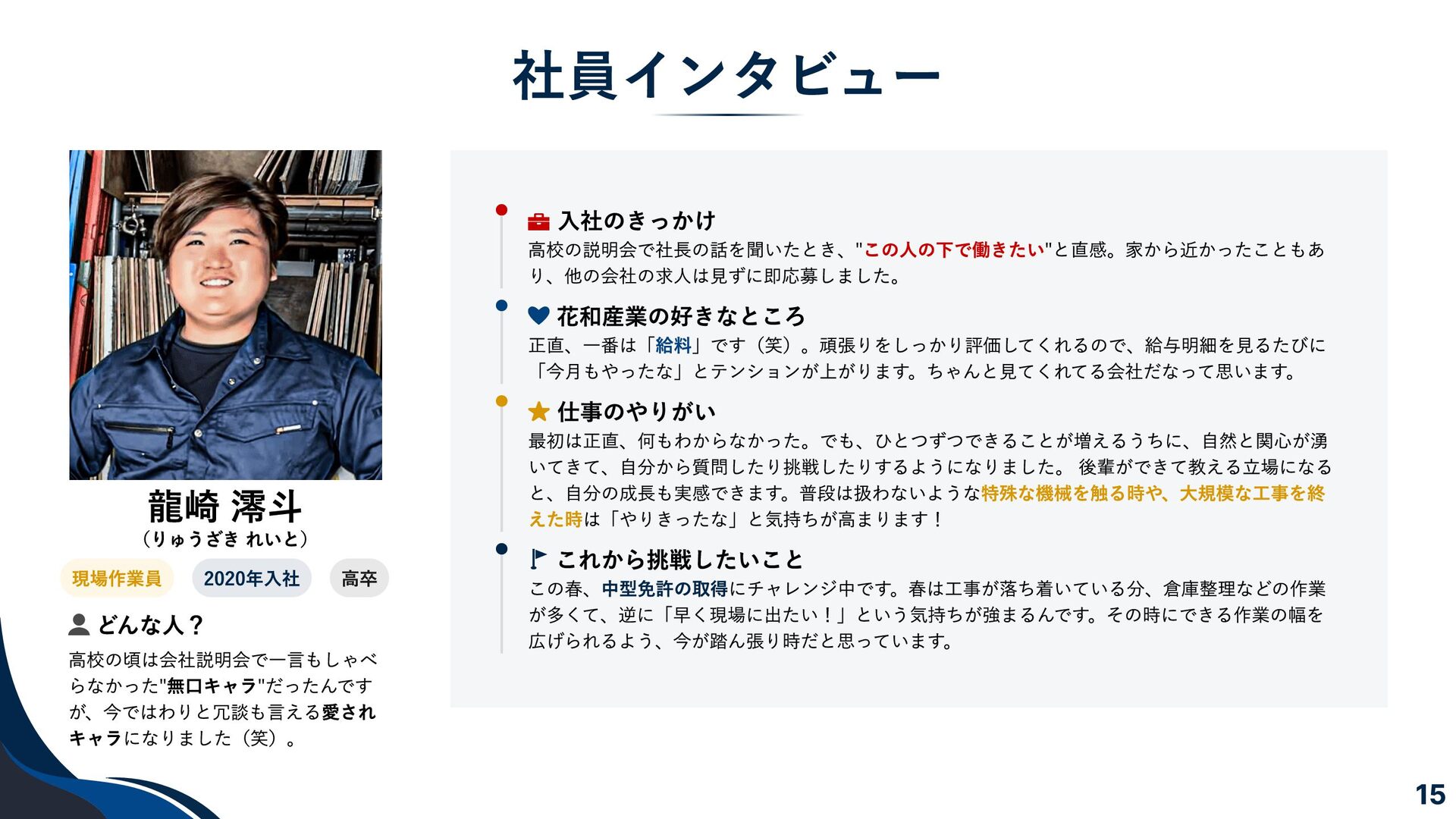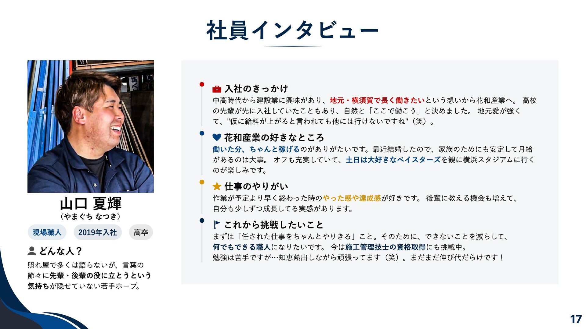 1988 特殊土木工事 (小口径推進工事・薬液注入工事)開始 1989 資本金3,500万に増資 1994 資本金8,500万に増資 有限会社花和産業から組織変更し、 株式会社花和産業とする 2001 ISO9001認証取得 2002 公共建築工事開始 2010 年間完工高7億円 2012 資本金13,600万円 2013 資本金9,520万に減資 2017 年間完工高11億円 2018 建設業労働安全マネジメントシステム 「COHSMS」認定取得 2019 年間完工高8億7千万円 2021 年間完工高20億円 2023 年間完工高12億 4 千万円 2024 年間完工高1 4 億2千万円 2010年 ~ 202 4 年 の約 15年間 で 年間完工高 は 2 倍 に 沿革 3