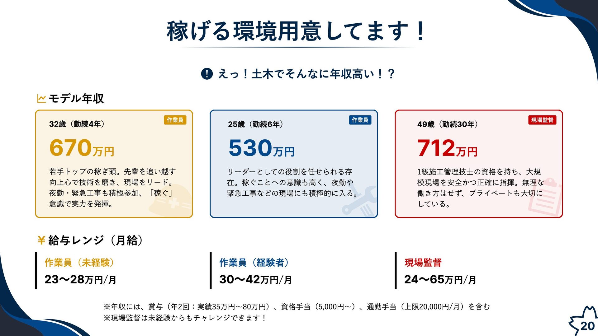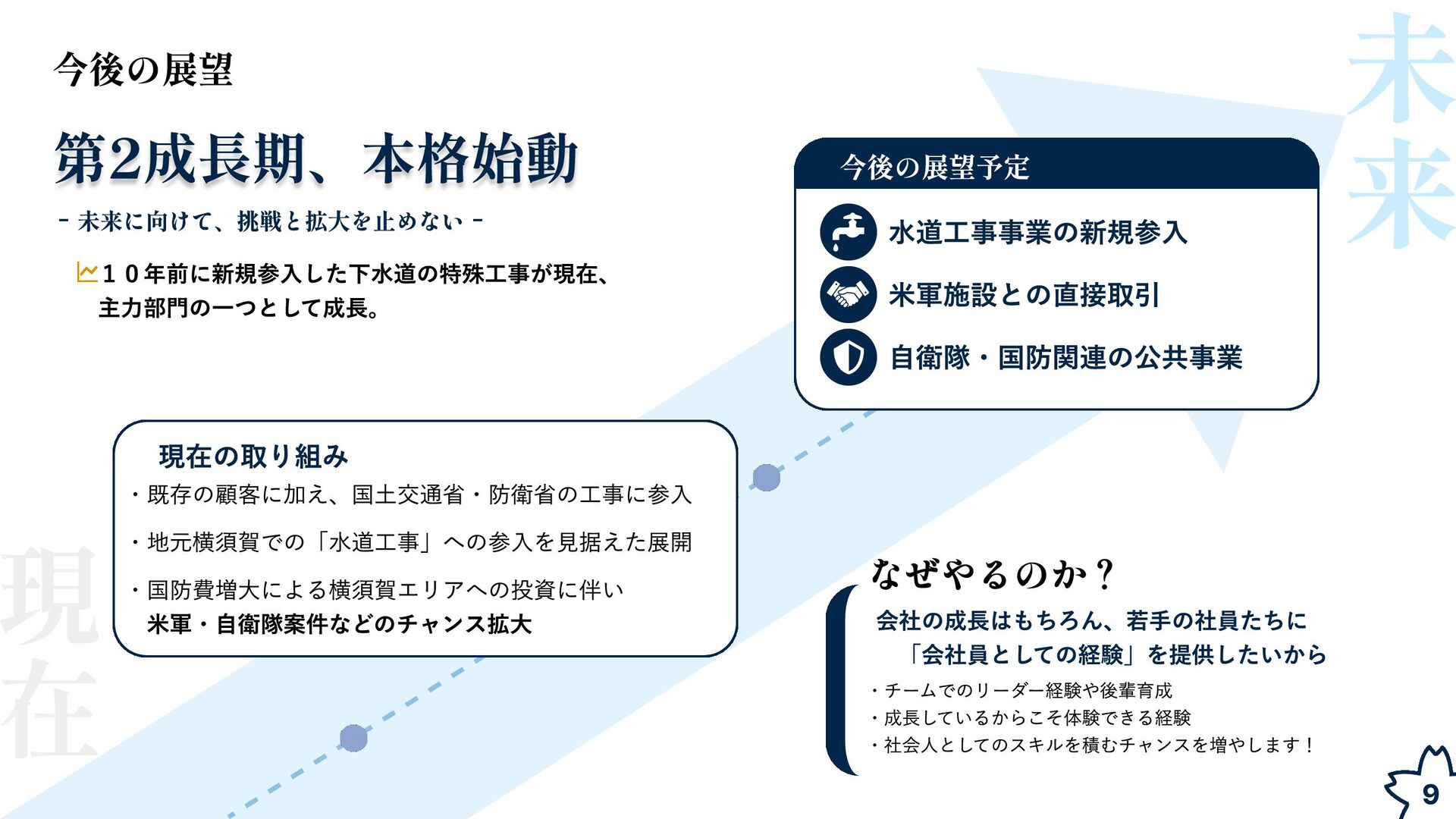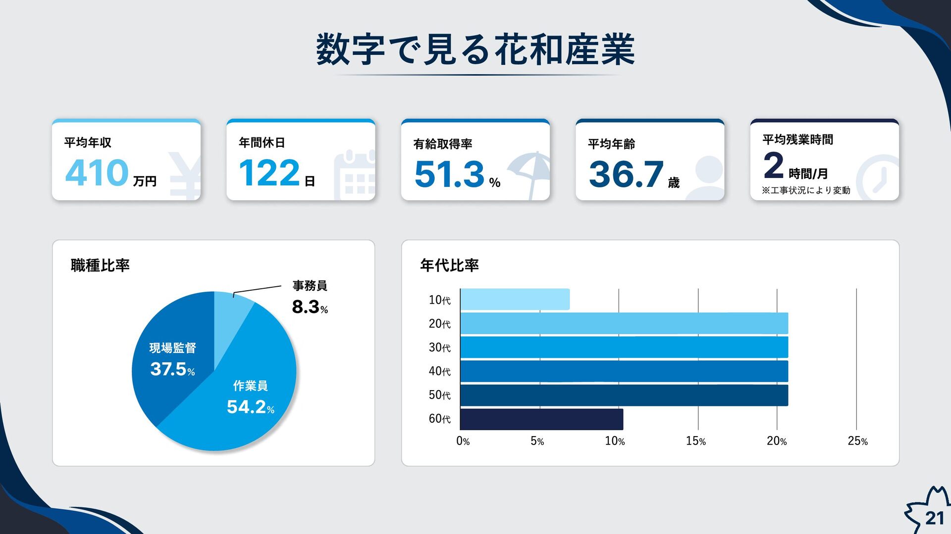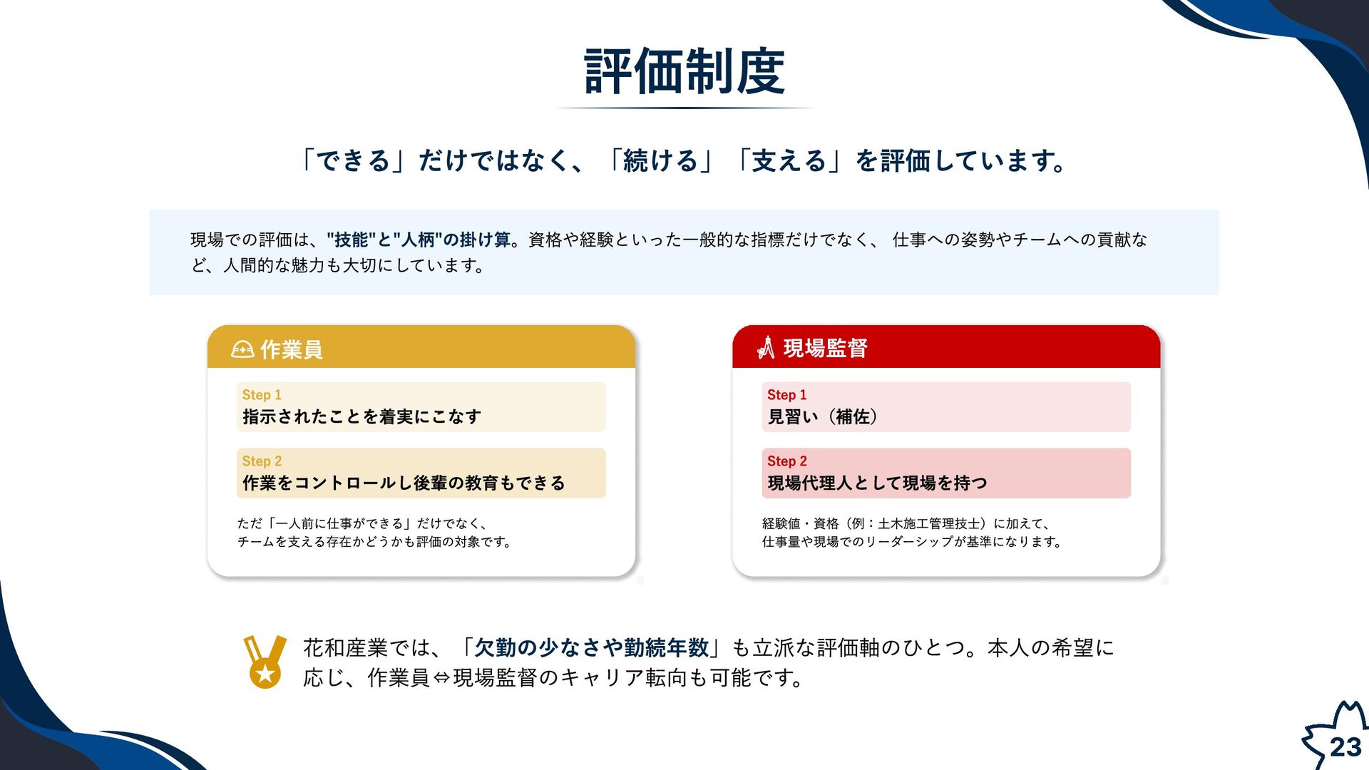1988 特殊土木工事 (小口径推進工事・薬液注入工事)開始 1989 資本金3,500万に増資 1994 資本金8,500万に増資 有限会社花和産業から組織変更し、 株式会社花和産業とする 2001 ISO9001認証取得 2002 公共建築工事開始 2010 年間完工高7億円 2012 資本金13,600万円 2013 資本金9,520万に減資 2017 年間完工高11億円 2018 建設業労働安全マネジメントシステム 「COHSMS」認定取得 2019 年間完工高8億7千万円 2021 年間完工高20億円 2023 年間完工高12億 4 千万円 2024 年間完工高1 4 億2千万円 2010年 ~ 202 4 年 の約 15年間 で 年間完工高 は 2 倍 に 沿革 3