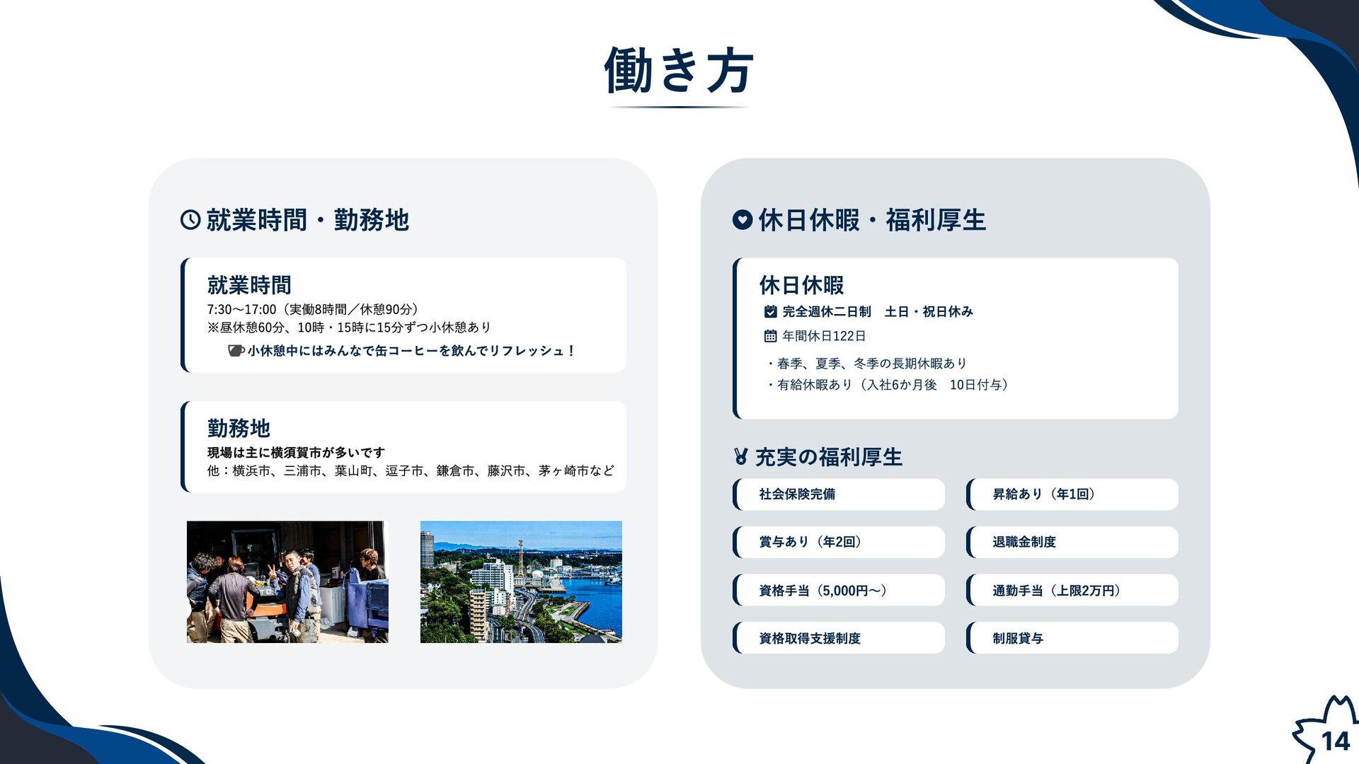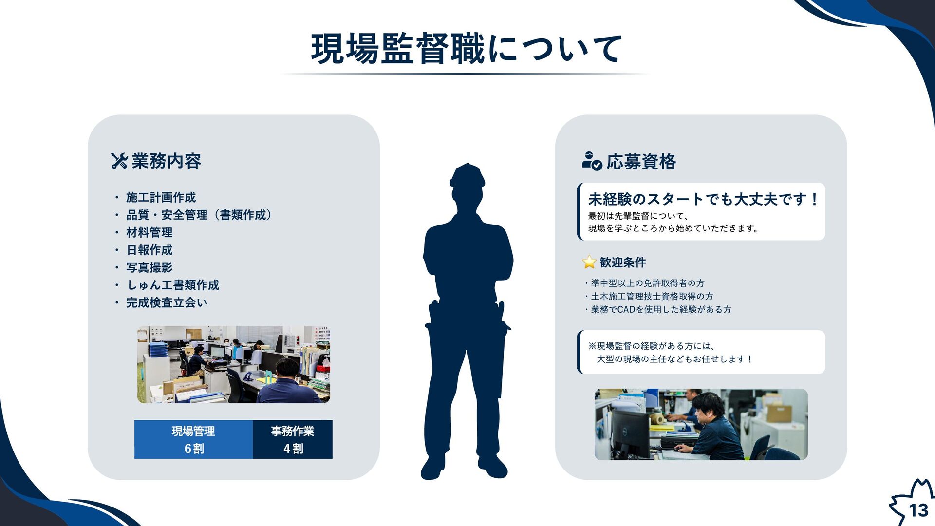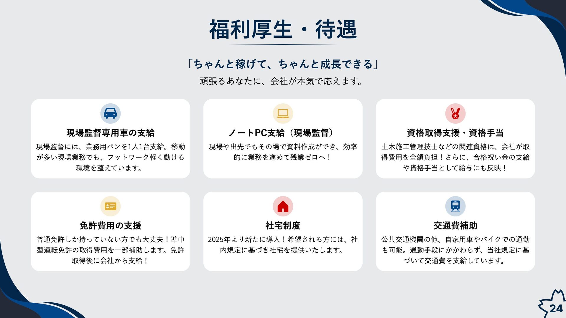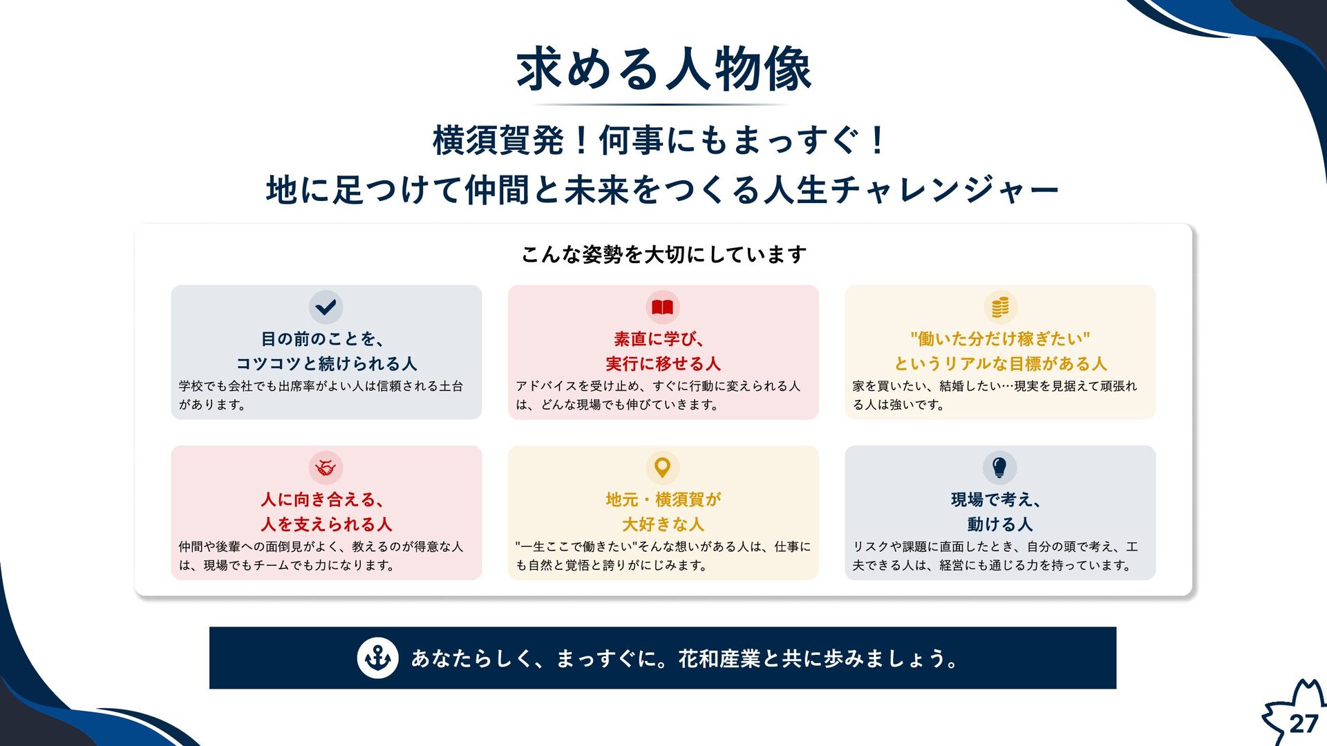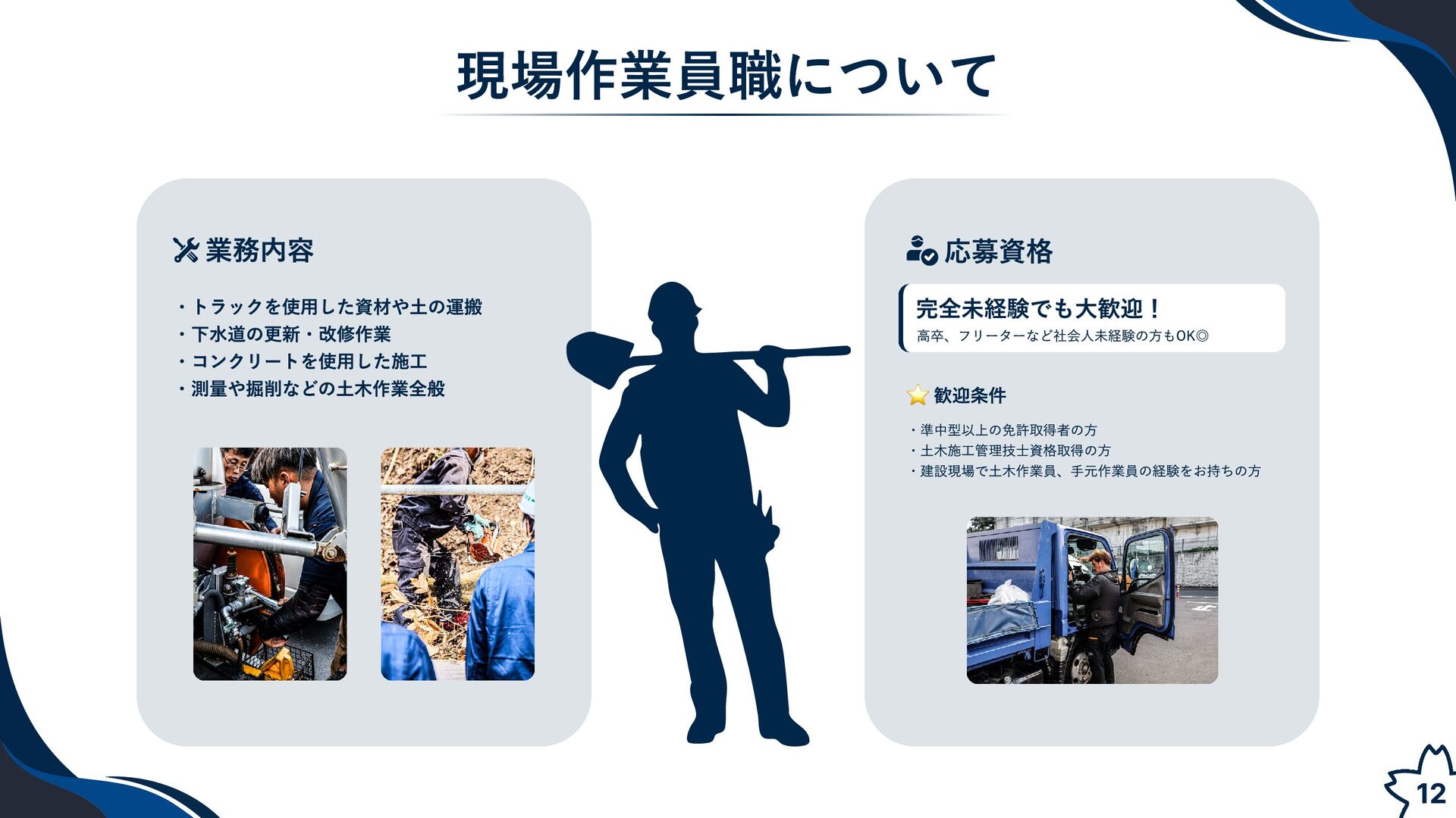 1988 特殊土木工事 (小口径推進工事・薬液注入工事)開始 1989 資本金3,500万に増資 1994 資本金8,500万に増資 有限会社花和産業から組織変更し、 株式会社花和産業とする 2001 ISO9001認証取得 2002 公共建築工事開始 2010 年間完工高7億円 2012 資本金13,600万円 2013 資本金9,520万に減資 2017 年間完工高11億円 2018 建設業労働安全マネジメントシステム 「COHSMS」認定取得 2019 年間完工高8億7千万円 2021 年間完工高20億円 2023 年間完工高12億 4 千万円 2024 年間完工高1 4 億2千万円 2010年 ~ 202 4 年 の約 15年間 で 年間完工高 は 2 倍 に 沿革 3
