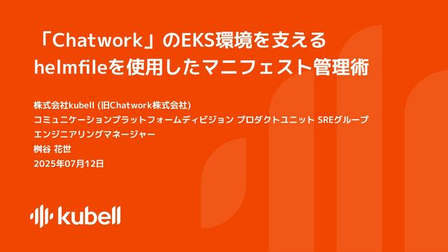 「Chatwork」のEKS環境を支える helmfileを使用したマニフェスト管理術 株式会社kubell (旧Chatwork株式会社) コミュニケーションプラットフォームディビジョン プロダクトユニット SREグループ エンジニアリングマネージャー 桝谷 花世