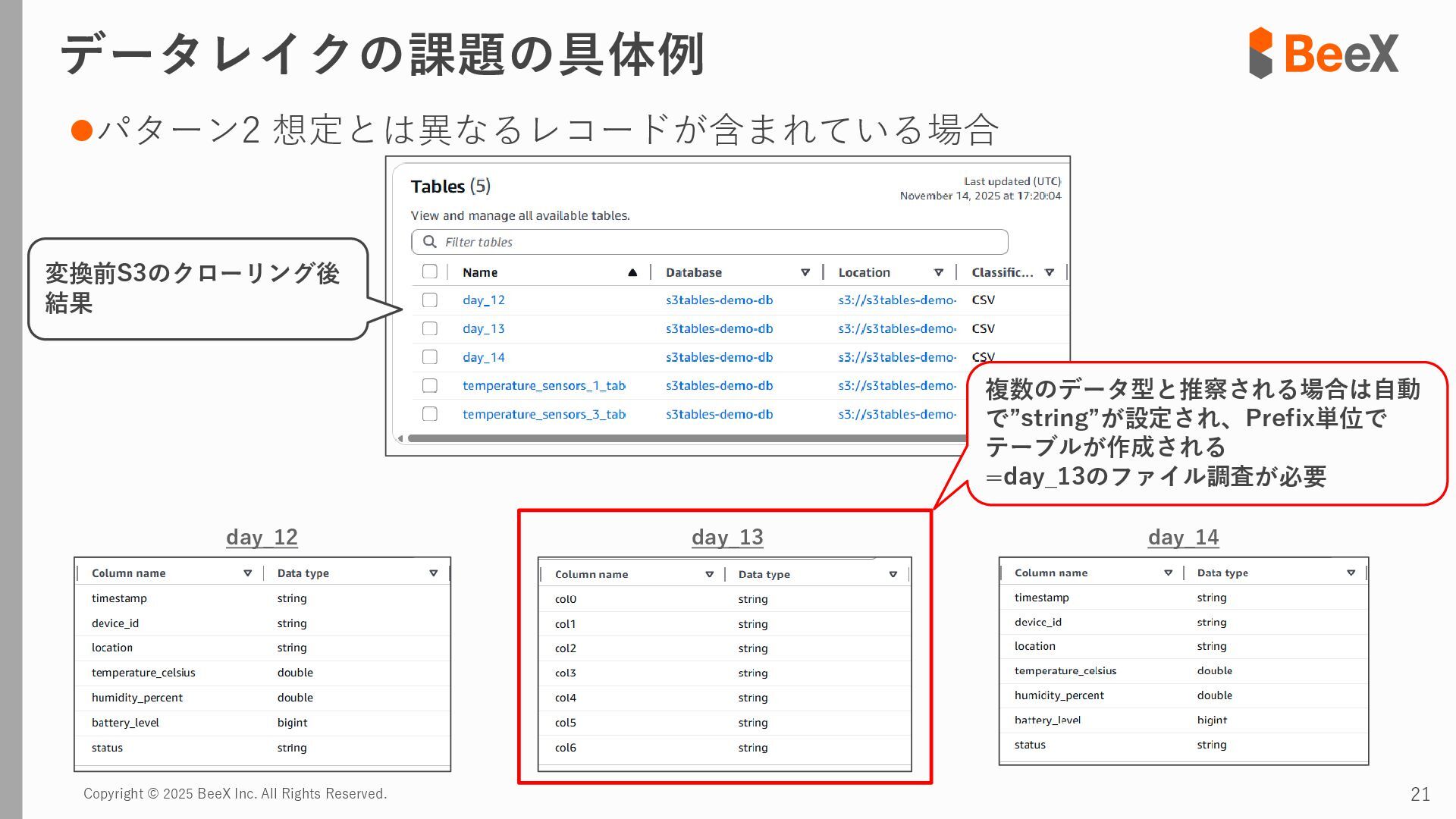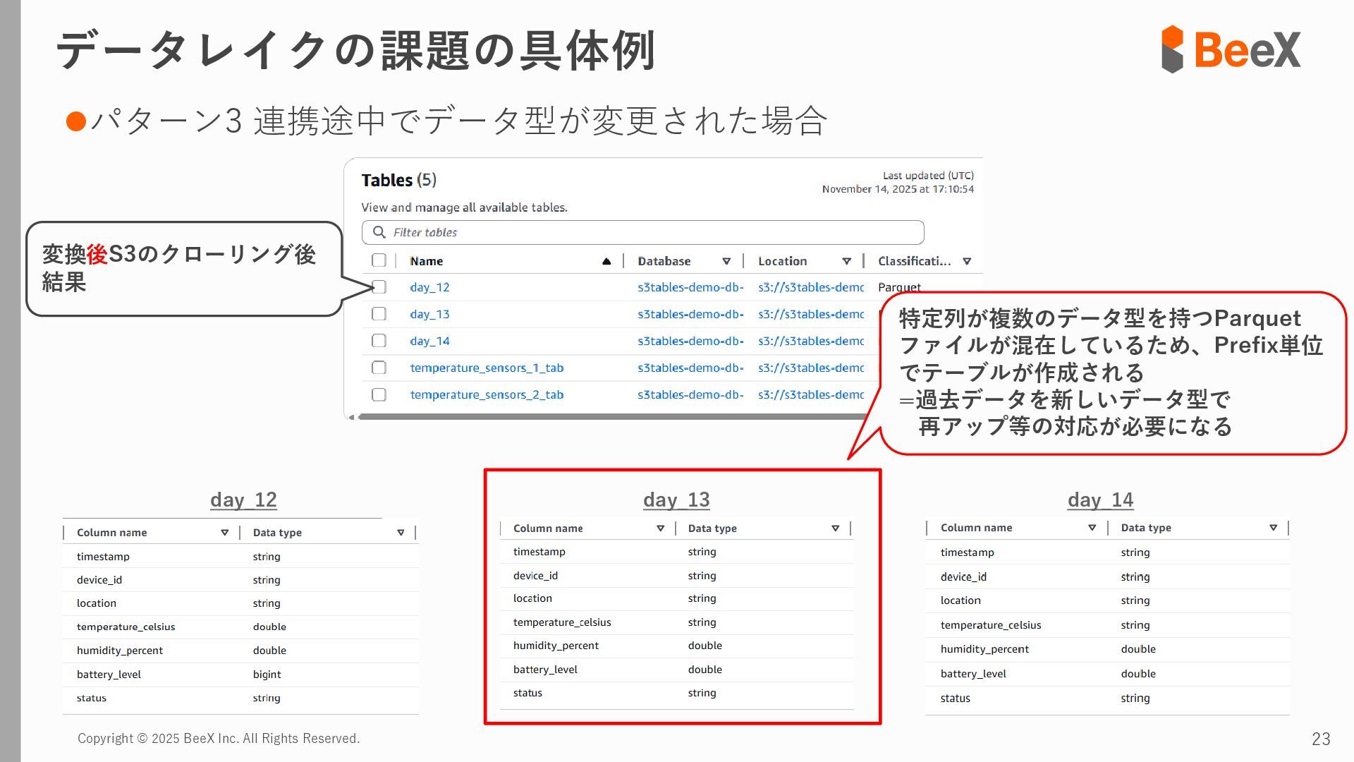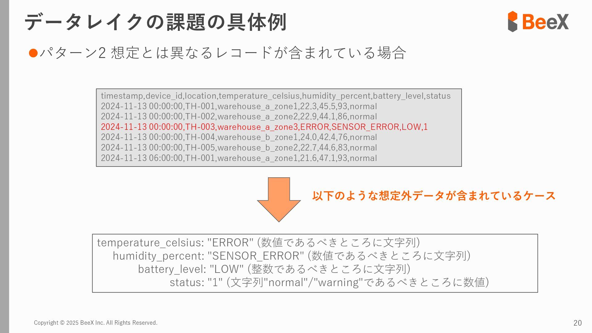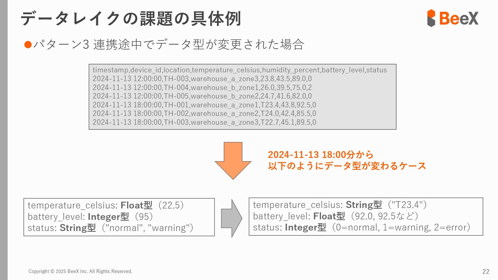 ⚫パターン3 連携途中でデータ型が変更された場合 timestamp,device_id,location,temperature_celsius,humidity_percent,battery_level,status 2024-11-13 12:00:00,TH-003,warehouse_a_zone3,23.8,43.5,89.0,0 2024-11-13 12:00:00,TH-004,warehouse_b_zone1,26.0,39.5,75.0,2 2024-11-13 12:00:00,TH-005,warehouse_b_zone2,24.7,41.6,82.0,0 2024-11-13 18:00:00,TH-001,warehouse_a_zone1,T23.4,43.8,92.5,0 2024-11-13 18:00:00,TH-002,warehouse_a_zone2,T24.0,42.4,85.5,0 2024-11-13 18:00:00,TH-003,warehouse_a_zone3,T22.7,45.1,89.5,0 temperature_celsius: Float型(22.5) battery_level: Integer型(95) status: String型("normal", "warning") temperature_celsius: String型("T23.4") battery_level: Float型(92.0, 92.5など) status: Integer型(0=normal, 1=warning, 2=error) 2024-11-13 18:00分から 以下のようにデータ型が変わるケース