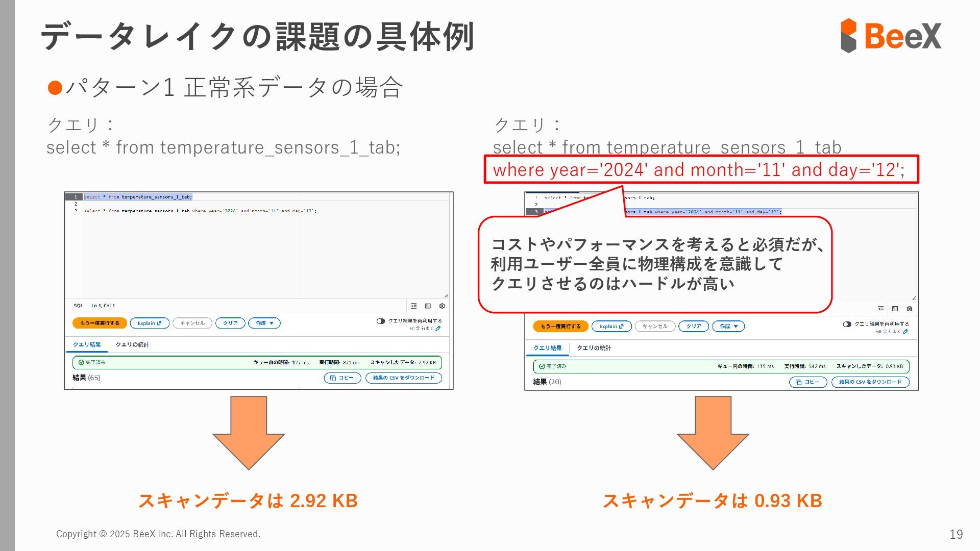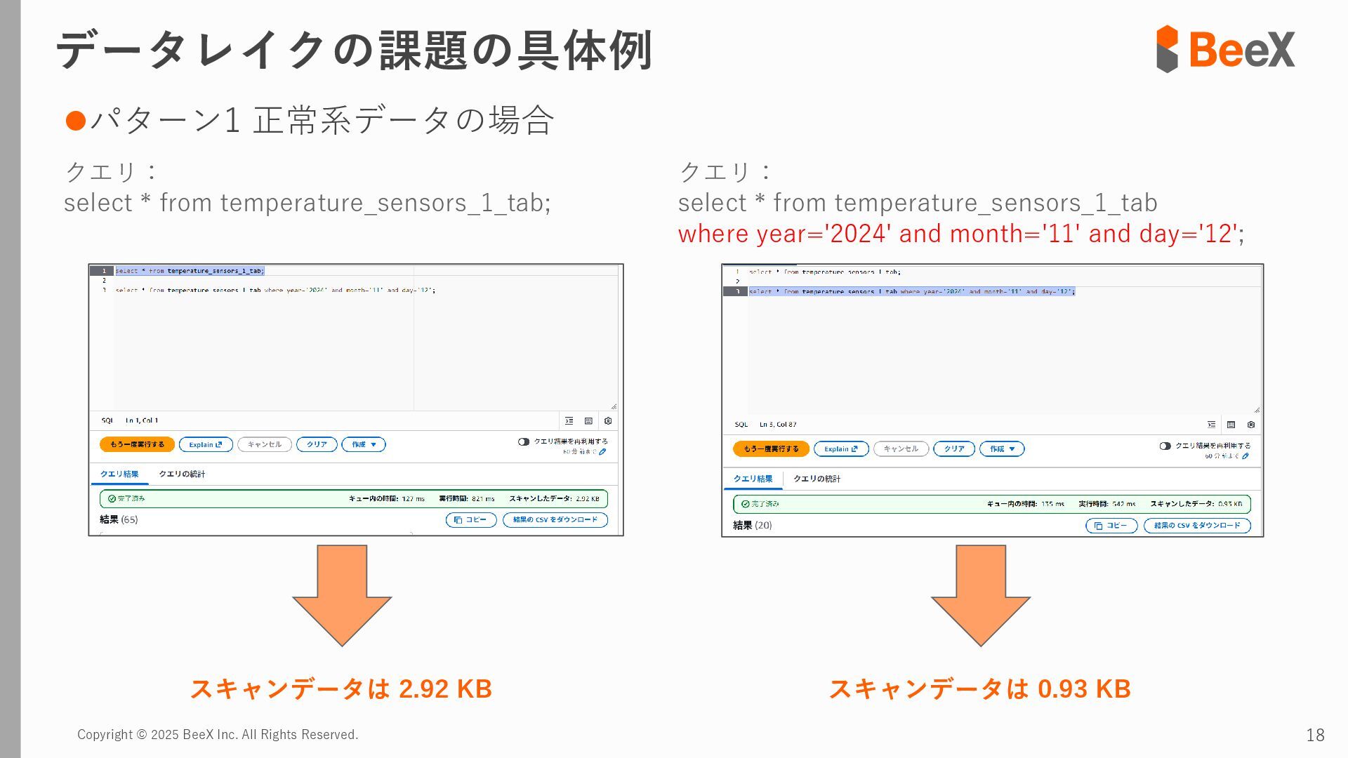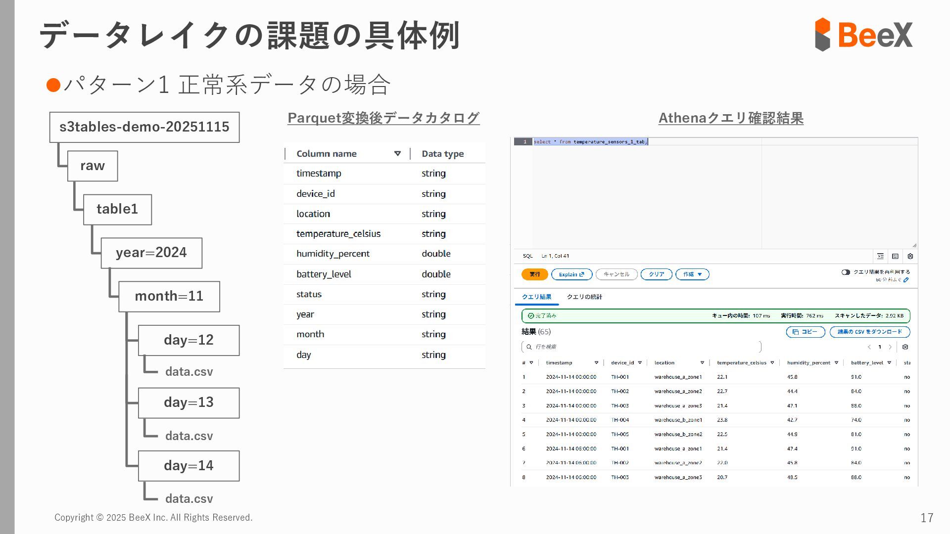 ⚫パターン3 連携途中でデータ型が変更された場合 timestamp,device_id,location,temperature_celsius,humidity_percent,battery_level,status 2024-11-13 12:00:00,TH-003,warehouse_a_zone3,23.8,43.5,89.0,0 2024-11-13 12:00:00,TH-004,warehouse_b_zone1,26.0,39.5,75.0,2 2024-11-13 12:00:00,TH-005,warehouse_b_zone2,24.7,41.6,82.0,0 2024-11-13 18:00:00,TH-001,warehouse_a_zone1,T23.4,43.8,92.5,0 2024-11-13 18:00:00,TH-002,warehouse_a_zone2,T24.0,42.4,85.5,0 2024-11-13 18:00:00,TH-003,warehouse_a_zone3,T22.7,45.1,89.5,0 temperature_celsius: Float型(22.5) battery_level: Integer型(95) status: String型("normal", "warning") temperature_celsius: String型("T23.4") battery_level: Float型(92.0, 92.5など) status: Integer型(0=normal, 1=warning, 2=error) 2024-11-13 18:00分から 以下のようにデータ型が変わるケース