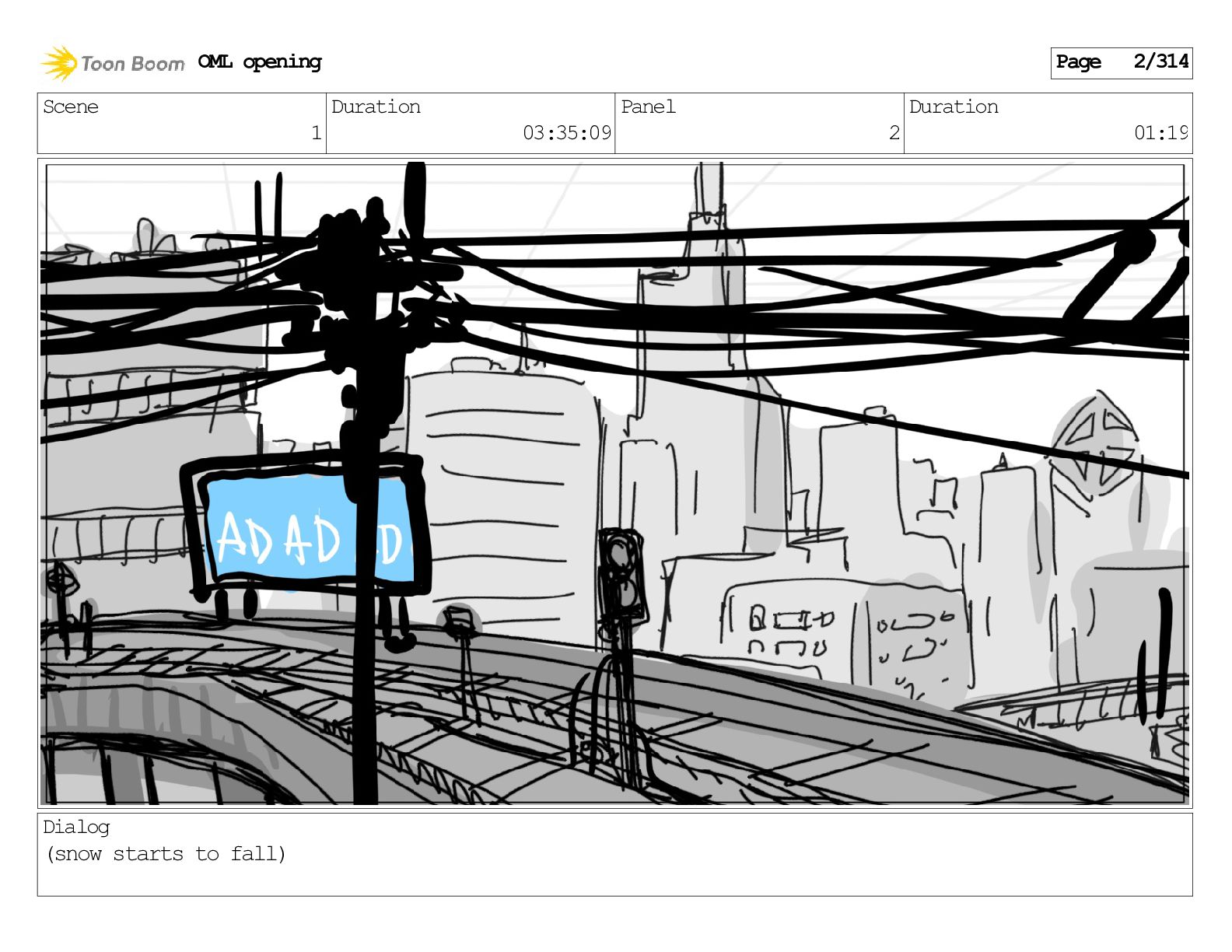 Scene 1 Duration 03:35:09 Panel 2 Duration 01:19 Dialog (snow