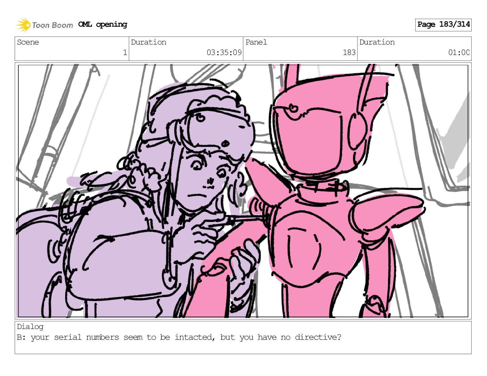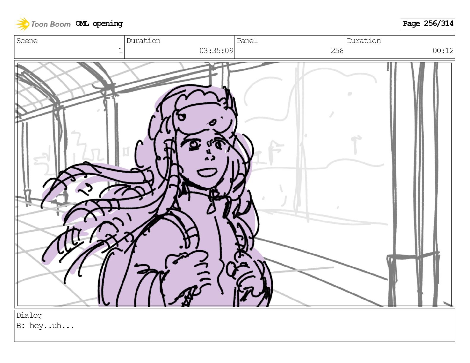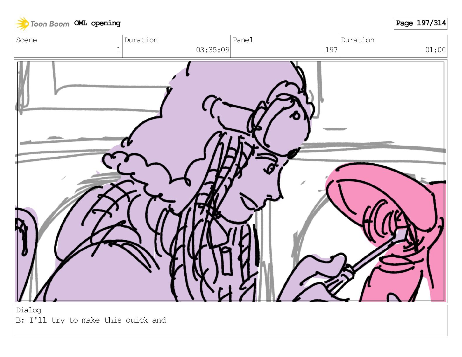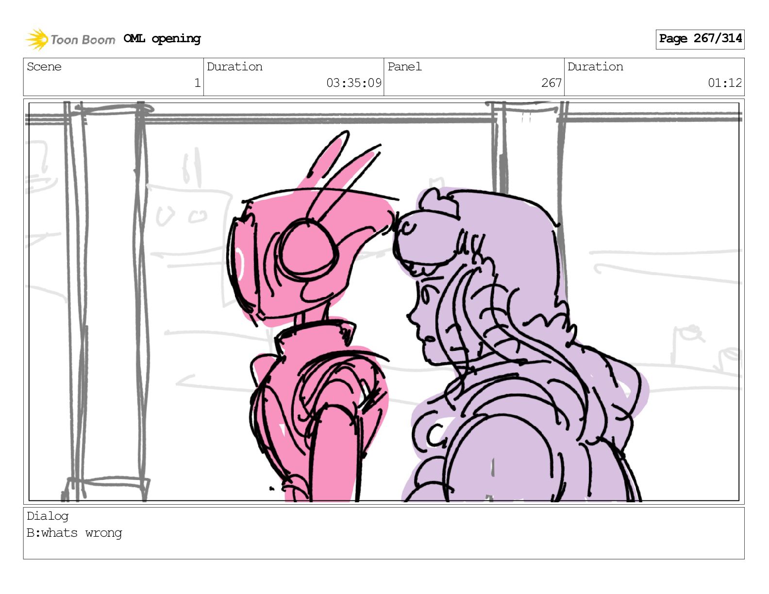 Scene 1 Duration 03:35:09 Panel 267 Duration 01:12 Dialog B:whats