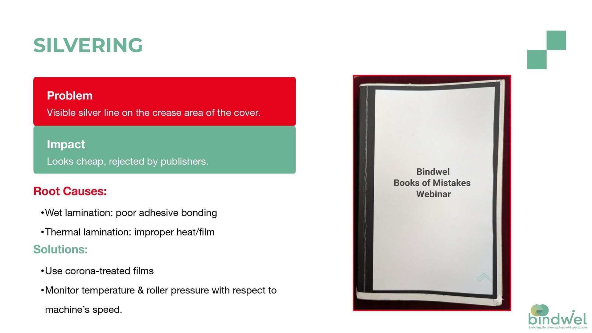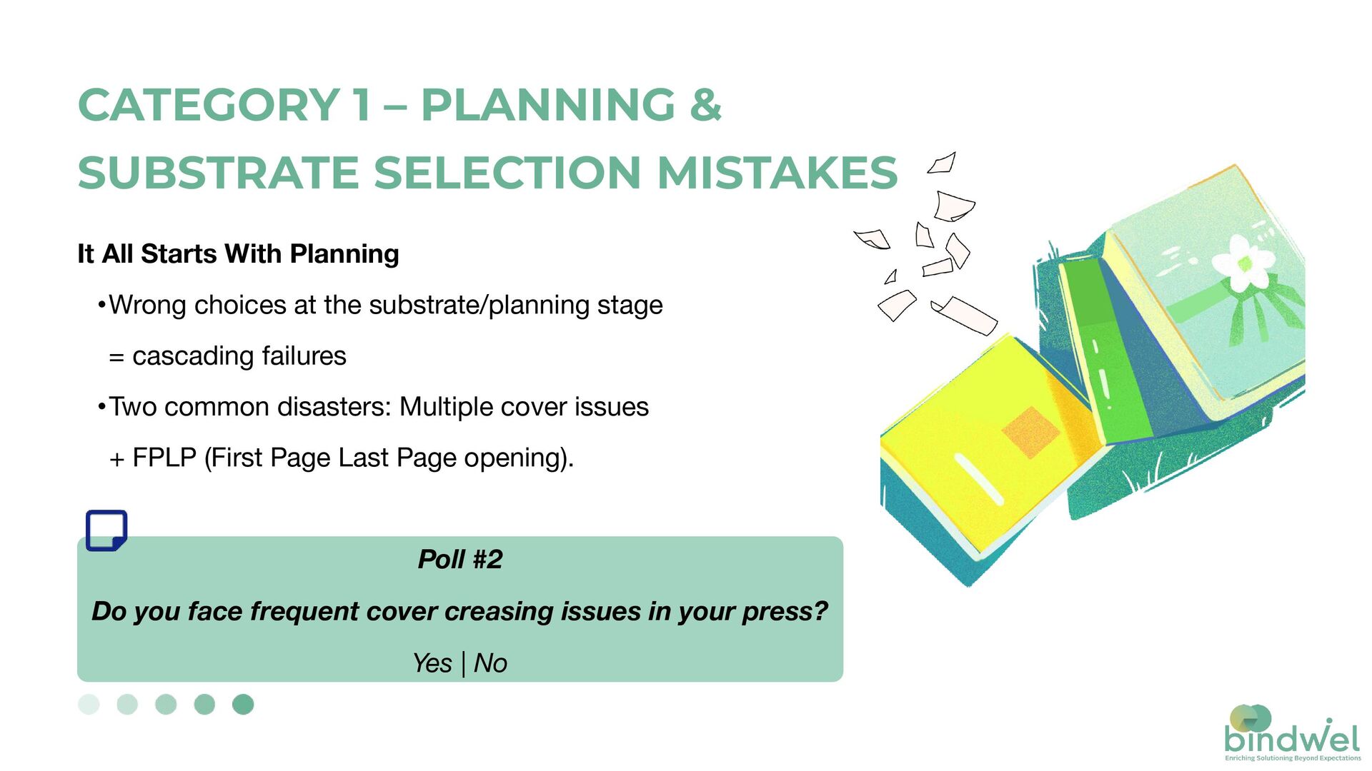 stage = cascading failures •Two common disasters: Multiple cover issues + FPLP (First Page Last Page opening). Poll #2 Do you face frequent cover creasing issues in your press? Yes | No CATEGORY 1 – PLANNING & SUBSTRATE SELECTION MISTAKES