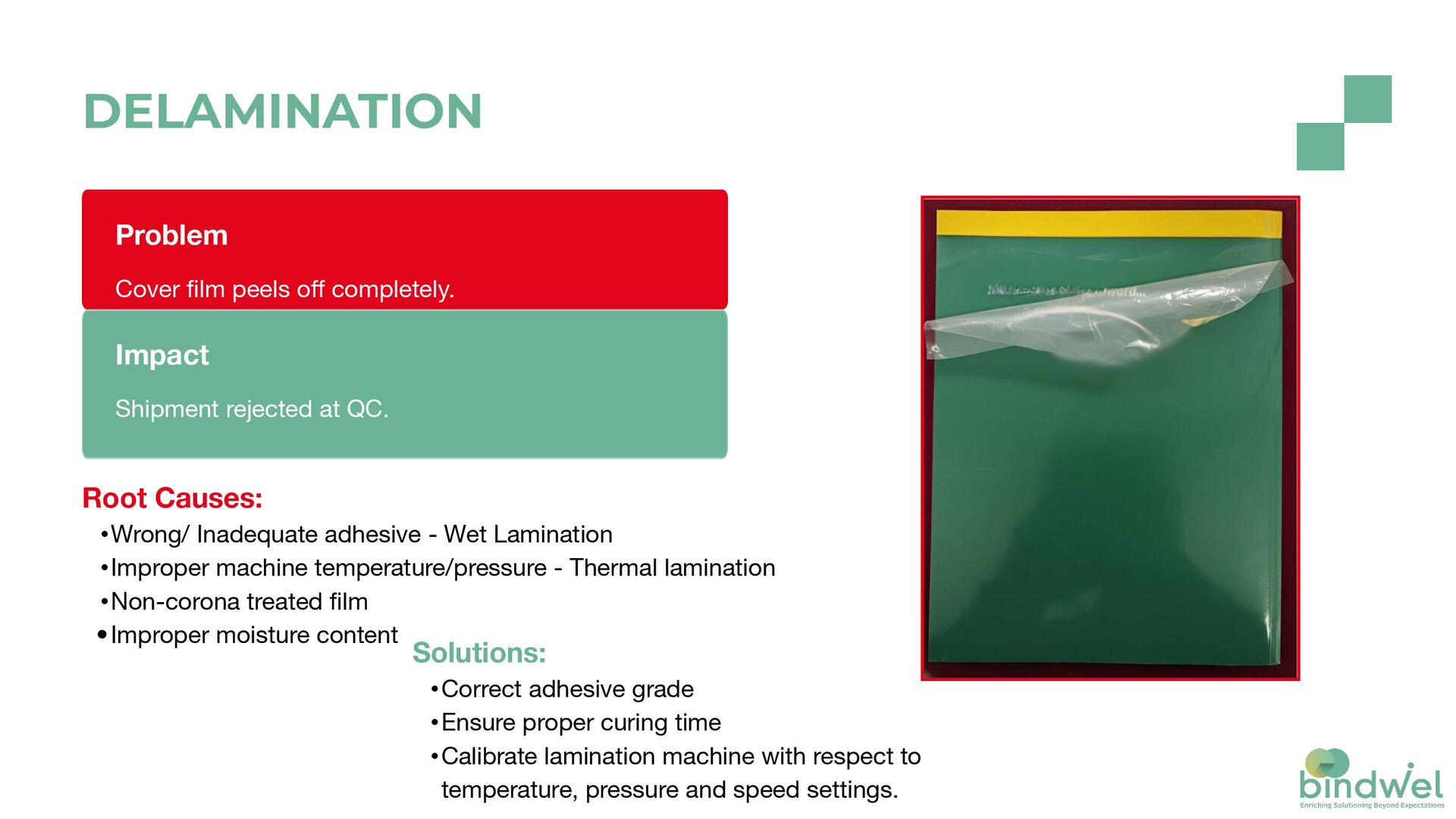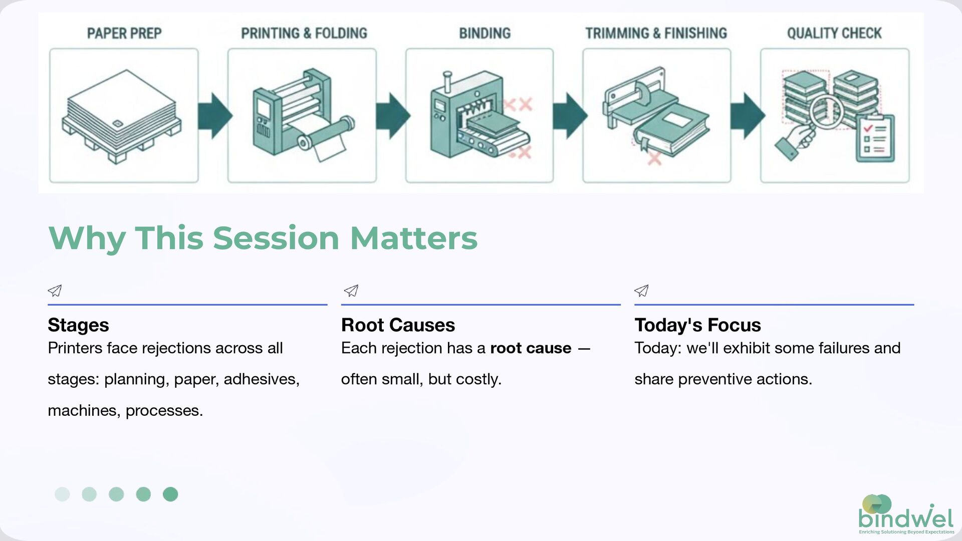 stages: planning, paper, adhesives, machines, processes. Root Causes Each rejection has a root cause — often small, but costly. Today's Focus Today: we'll exhibit some failures and share preventive actions.