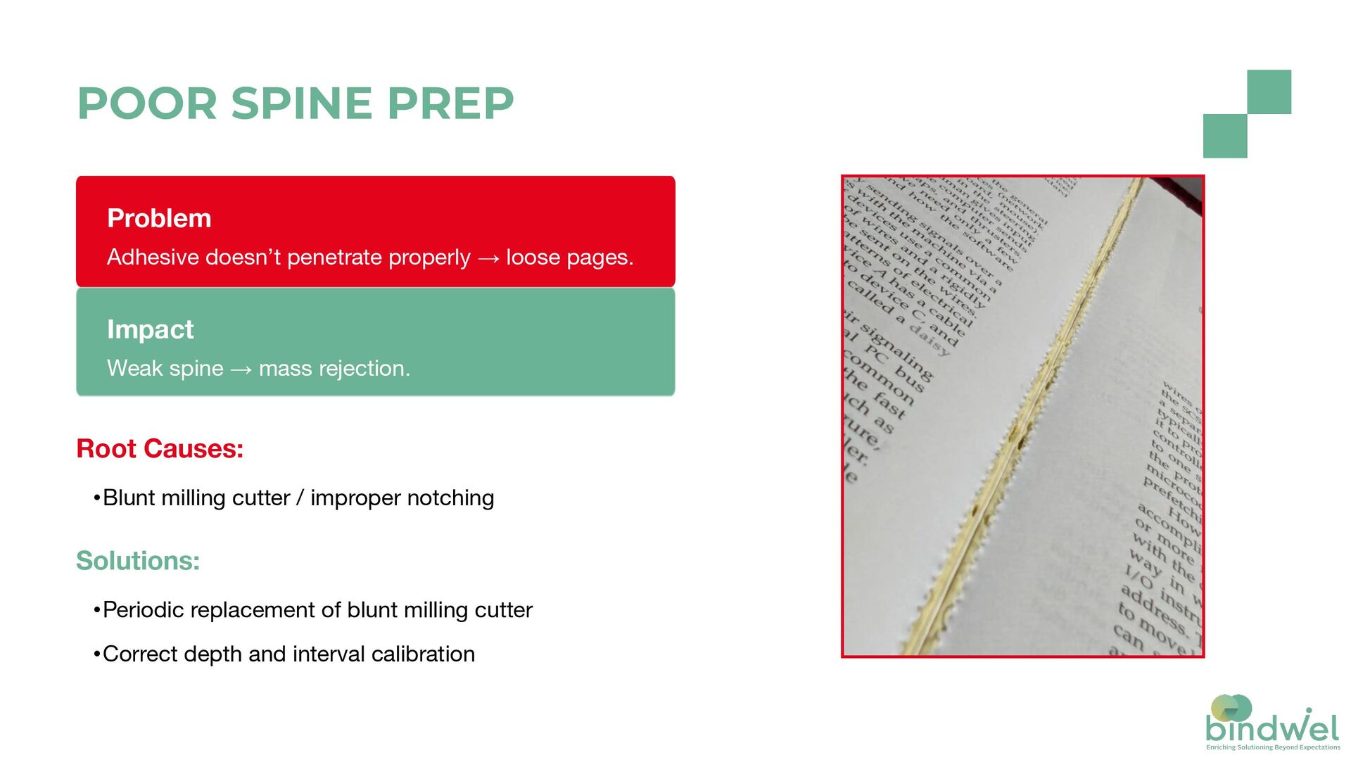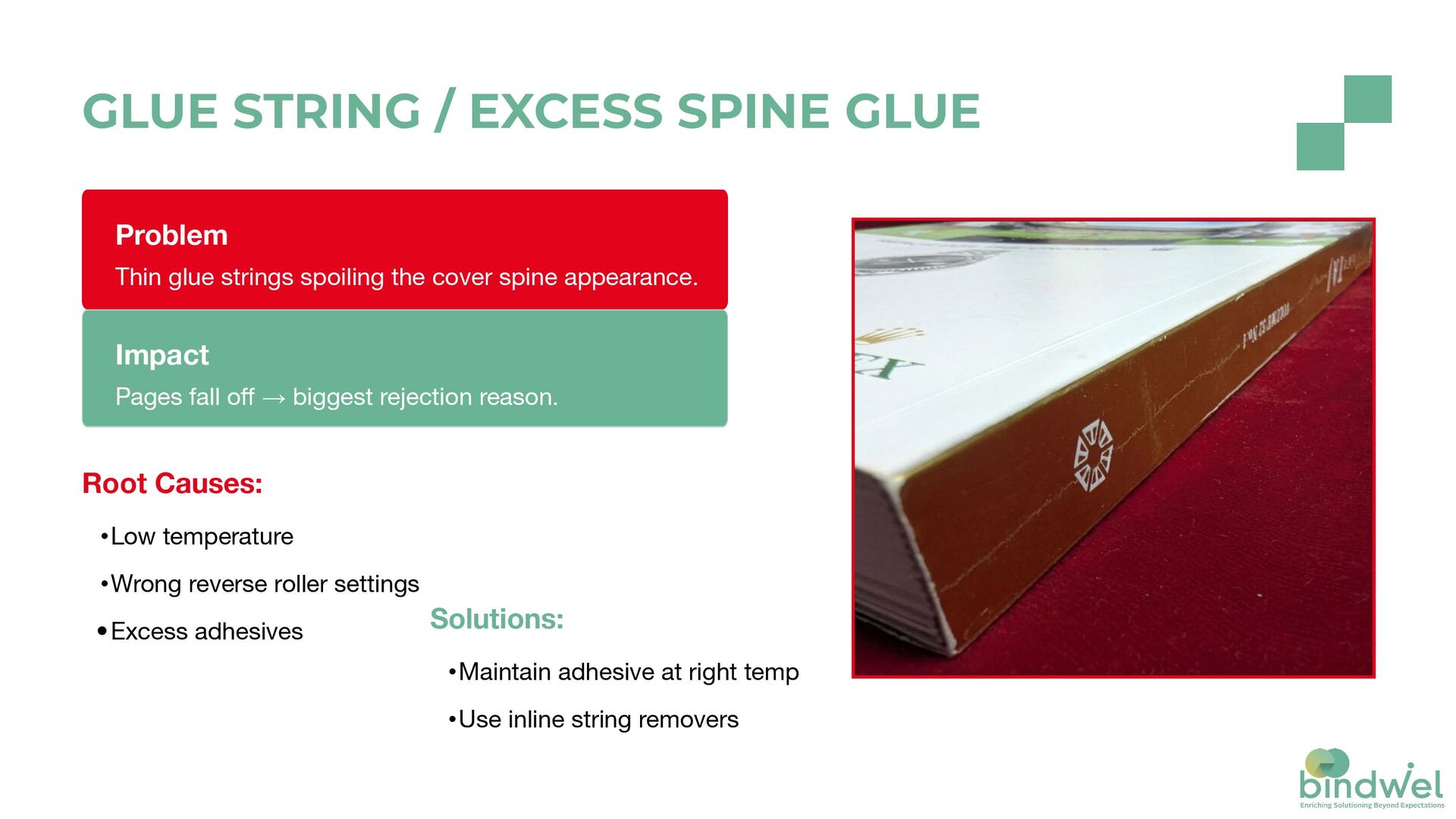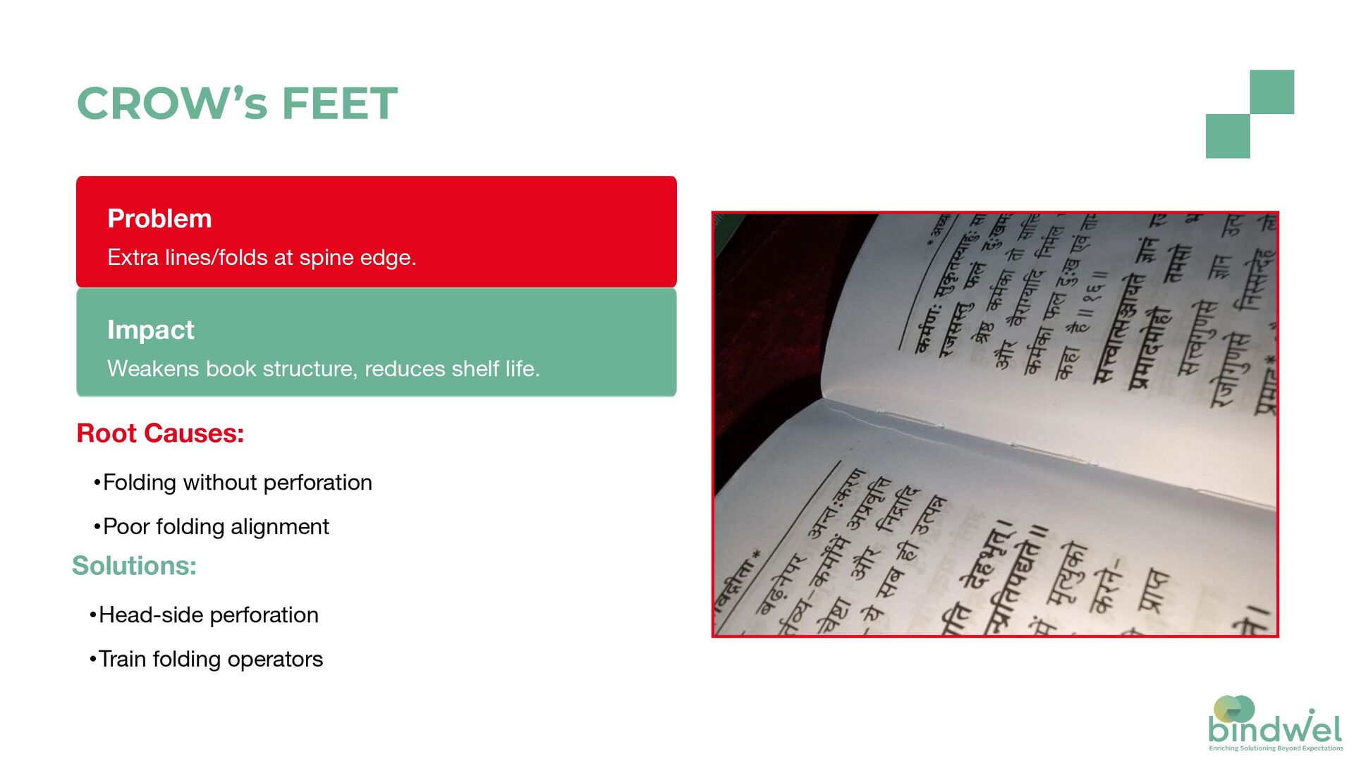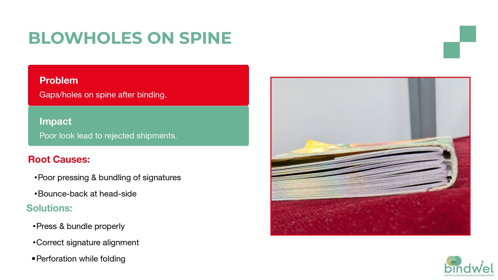 & bundling of signatures •Bounce-back at head-side Impact Poor look lead to rejected shipments. Solutions: •Press & bundle properly •Correct signature alignment •Perforation while folding BLOWHOLES ON SPINE