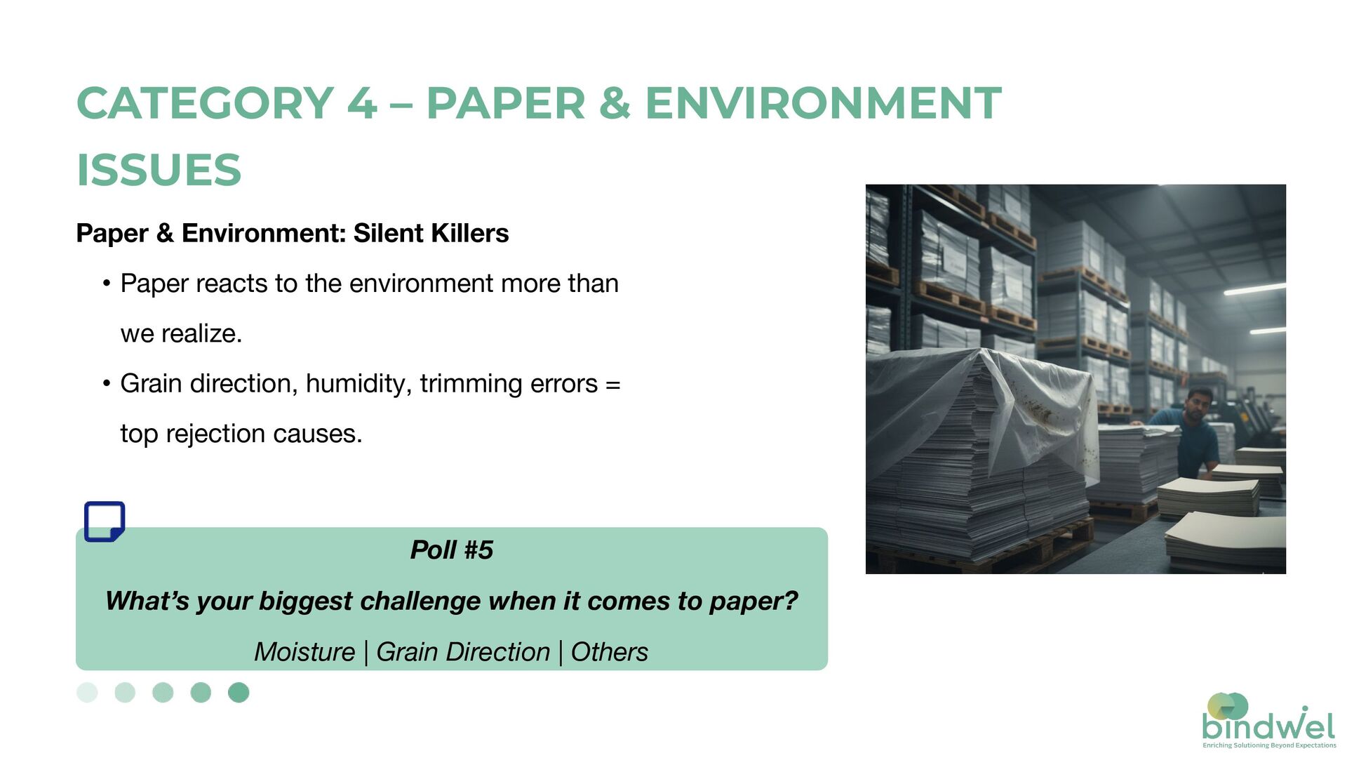 environment more than we realize. • Grain direction, humidity, trimming errors = top rejection causes. Poll #5 What’s your biggest challenge when it comes to paper? Moisture | Grain Direction | Others CATEGORY 4 – PAPER & ENVIRONMENT ISSUES