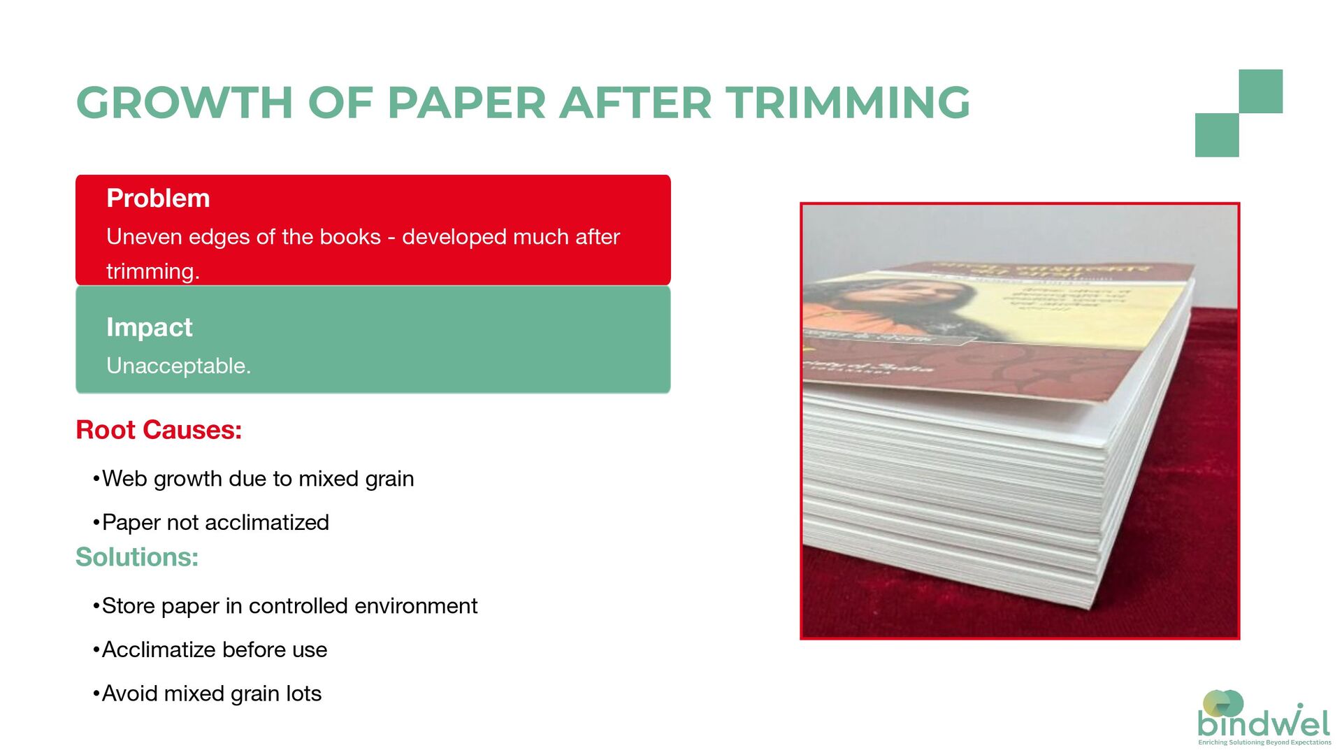 trimming. Root Causes: •Web growth due to mixed grain •Paper not acclimatized Impact Unacceptable. Solutions: •Store paper in controlled environment •Acclimatize before use •Avoid mixed grain lots GROWTH OF PAPER AFTER TRIMMING