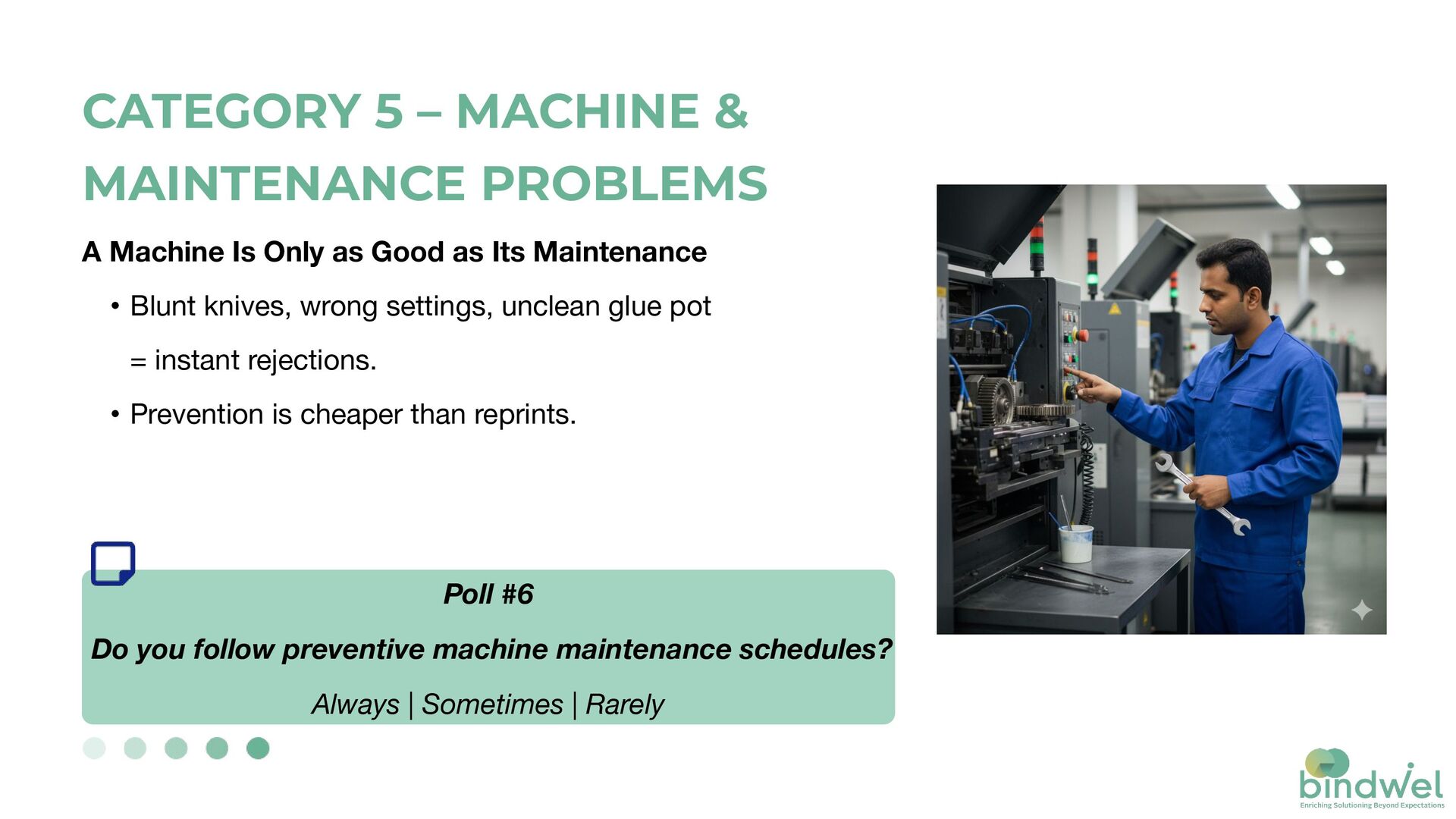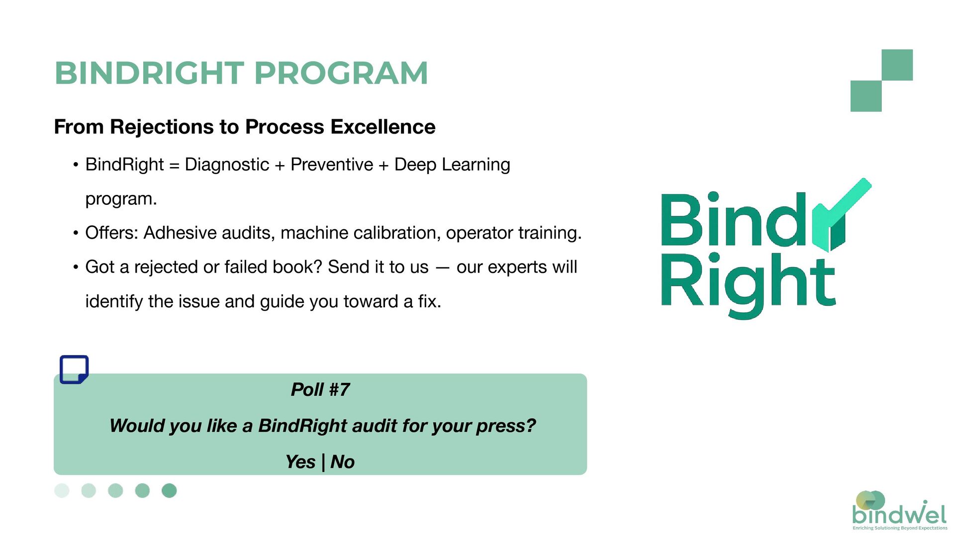 Preventive + Deep Learning program. • Offers: Adhesive audits, machine calibration, operator training. • Got a rejected or failed book? Send it to us — our experts will identify the issue and guide you toward a fix. Poll #7 Would you like a BindRight audit for your press? Yes | No BINDRIGHT PROGRAM