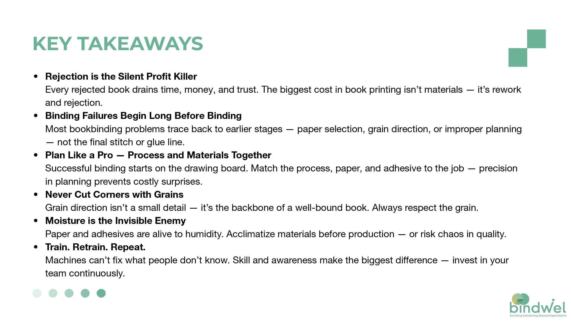 rejected book drains time, money, and trust. The biggest cost in book printing isn’t materials — it’s rework and rejection. • Binding Failures Begin Long Before Binding Most bookbinding problems trace back to earlier stages — paper selection, grain direction, or improper planning — not the final stitch or glue line. • Plan Like a Pro — Process and Materials Together Successful binding starts on the drawing board. Match the process, paper, and adhesive to the job — precision in planning prevents costly surprises. • Never Cut Corners with Grains Grain direction isn’t a small detail — it’s the backbone of a well-bound book. Always respect the grain. • Moisture is the Invisible Enemy Paper and adhesives are alive to humidity. Acclimatize materials before production — or risk chaos in quality. • Train. Retrain. Repeat. Machines can’t fix what people don’t know. Skill and awareness make the biggest difference — invest in your team continuously.