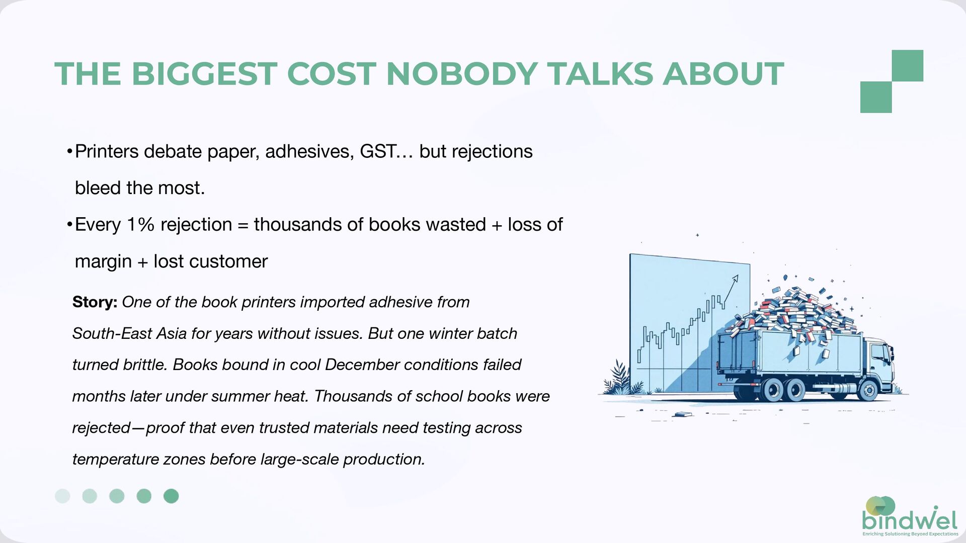 GST… but rejections bleed the most. •Every 1% rejection = thousands of books wasted + loss of margin + lost customer Story: One of the book printers imported adhesive from South-East Asia for years without issues. But one winter batch turned brittle. Books bound in cool December conditions failed months later under summer heat. Thousands of school books were rejected—proof that even trusted materials need testing across temperature zones before large-scale production.