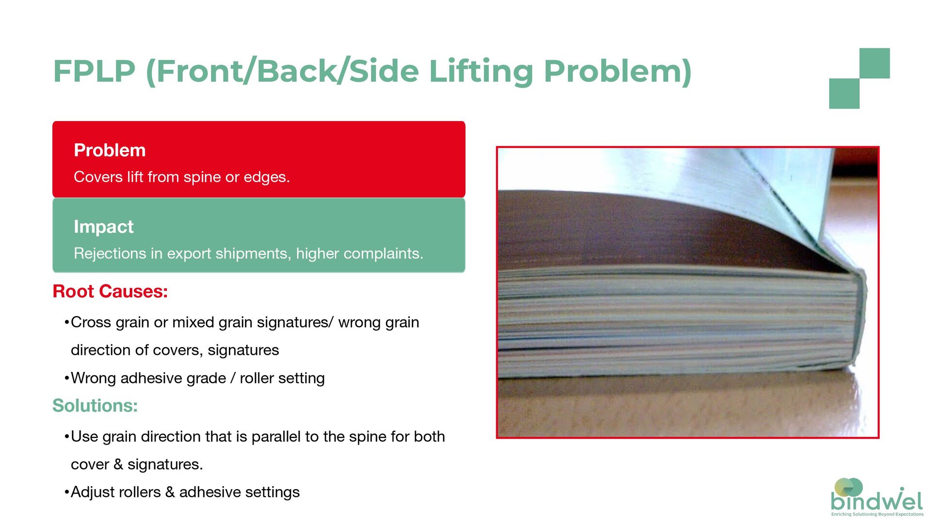 grain or mixed grain signatures/ wrong grain direction of covers, signatures •Wrong adhesive grade / roller setting Impact Rejections in export shipments, higher complaints. Solutions: •Use grain direction that is parallel to the spine for both cover & signatures. •Adjust rollers & adhesive settings FPLP (Front/Back/Side Lifting Problem)