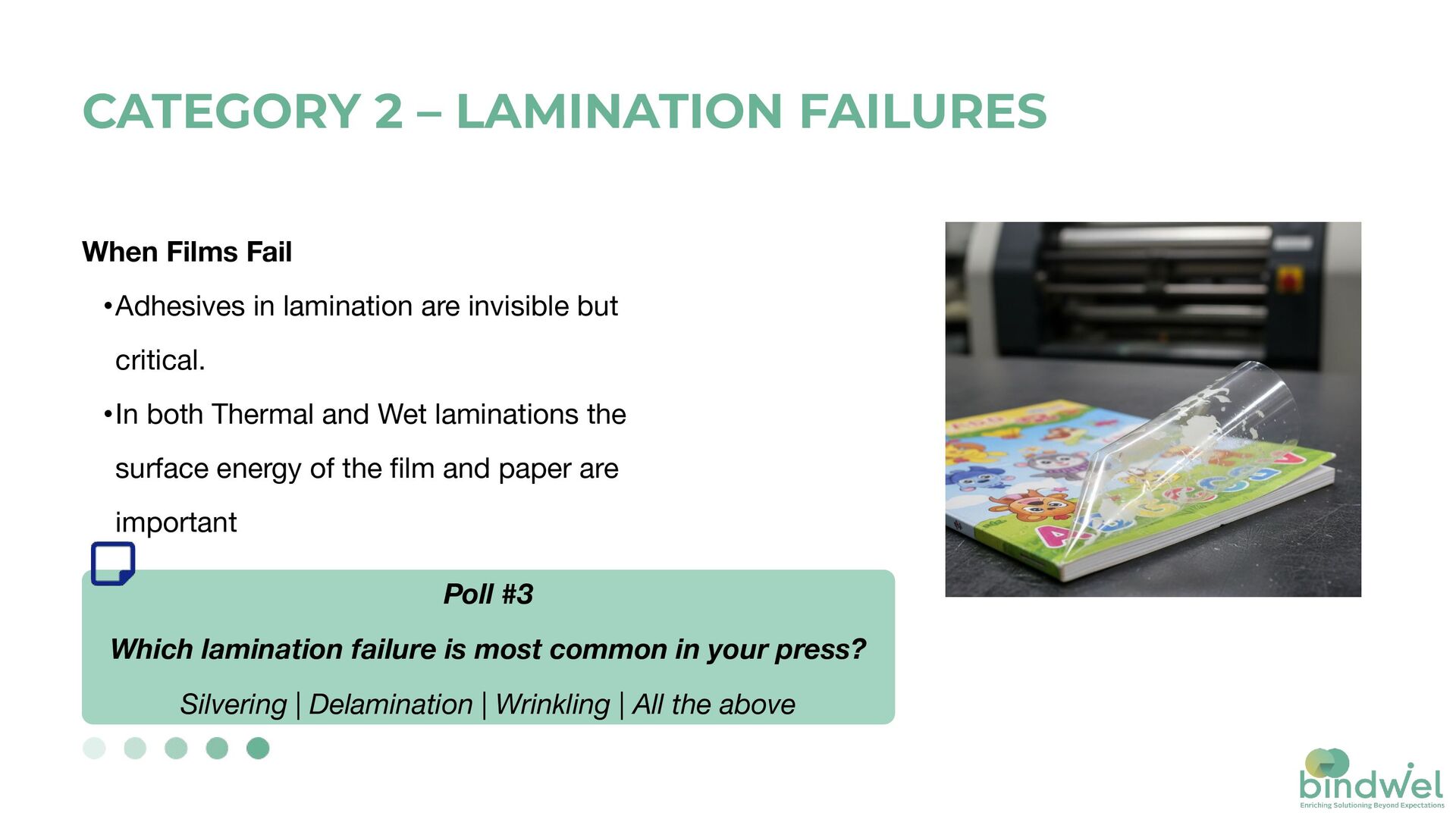 •In both Thermal and Wet laminations the surface energy of the film and paper are important Poll #3 Which lamination failure is most common in your press? Silvering | Delamination | Wrinkling | All the above CATEGORY 2 – LAMINATION FAILURES