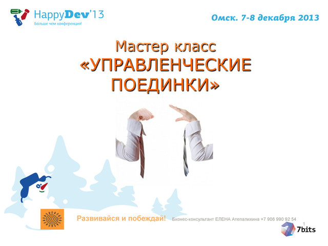 свою цель, при этом сохраняя имидж + героя 1. В поединке участвуют двое. Они могут выбрать себе секундантов. При нарушении секундант подымает руку и говорит “Стоп-‐игра!” -‐ говорит нарушение. Ведущий принимает-‐ не принимает. Секундант имеет право взять 1 раз за всю игру тайм-‐аут во время активного партии своего оппонента. 2. Ход передается поочередно. Если партнер вычерпал время, секундант об этом говорит ведущему, поднимая руку. ХОД: разыгрывается ПРАВО первого хода-‐раунда. Первый игрок говорит роли СЕБЕ и ПАРТНЕРУ. И начинает первым с момента окончания инструкции. Свой раунд он может прервать в любую минуту, переставив ФИГУРУ на сторону оппонента. За весь поединок мб сыграно несколько раундов и разыграно несколько ролей. 12 Развивайся и побеждай! Бизнес-консультант ЕЛЕНА Атепалихина +7 906 990 92 54