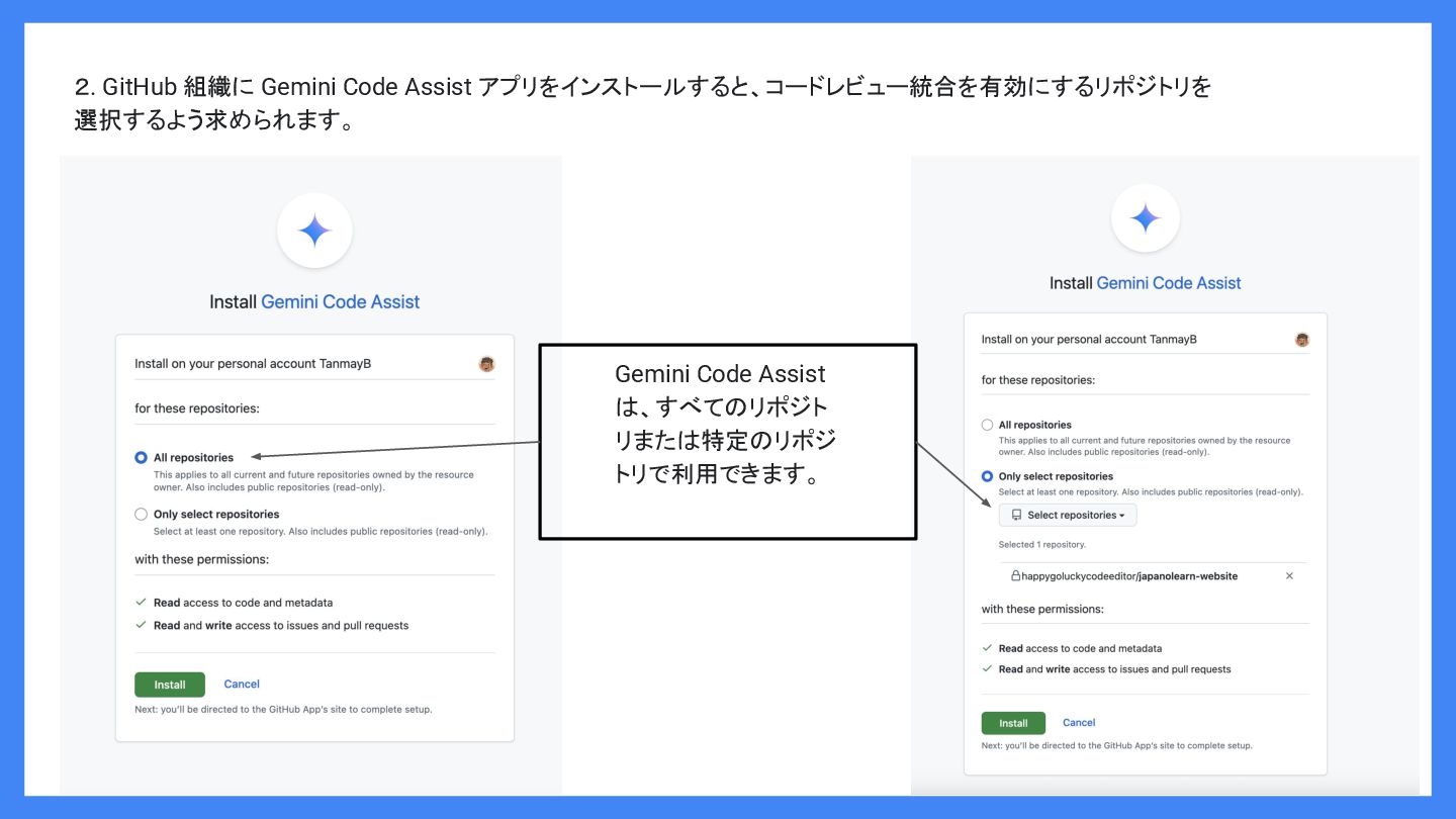 2. GitHub 組織に Gemini Code Assist アプリをインストールすると、コードレビュー統合を有効にするリポジトリを 選択するよう求められます。 Gemini Code