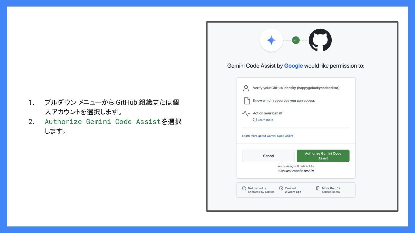 1. プルダウン メニューから GitHub 組織または個 人アカウントを選択します。 2. Authorize Gemini Code