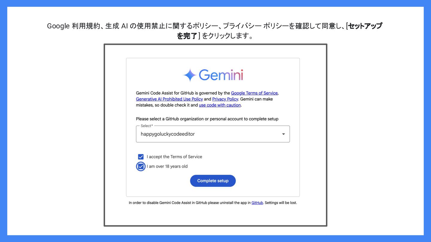 Google 利用規約、生成 AI の使用禁止に関するポリシー、プライバシー ポリシーを確認して同意し、[セットアップ を完了] をクリックします。
