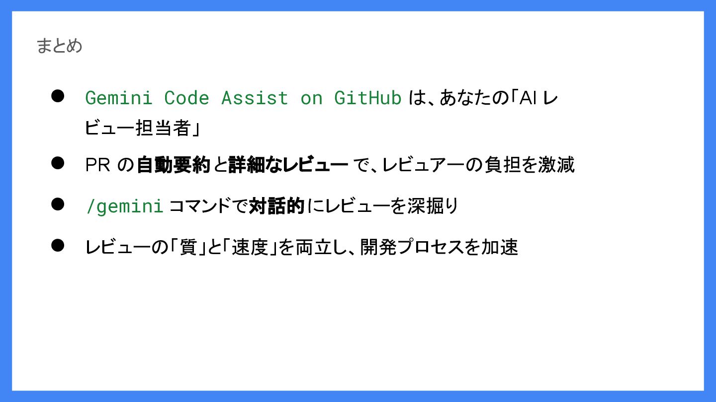 まとめ • Gemini Code Assist on GitHub は、あなたの「AI レ ビュー担当者」