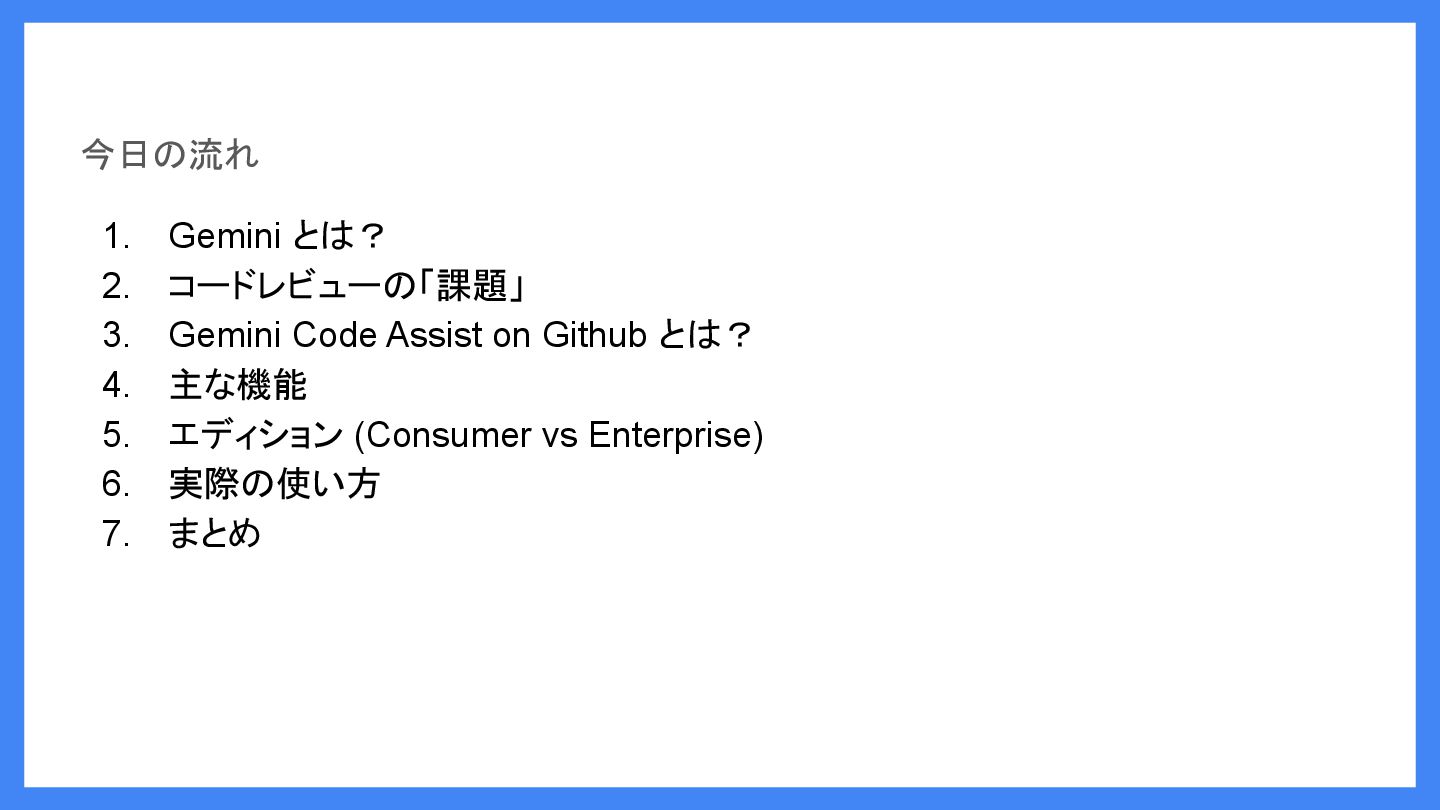 今日の流れ 1. Gemini とは? 2. コードレビューの「課題」 3. Gemini Code Assist