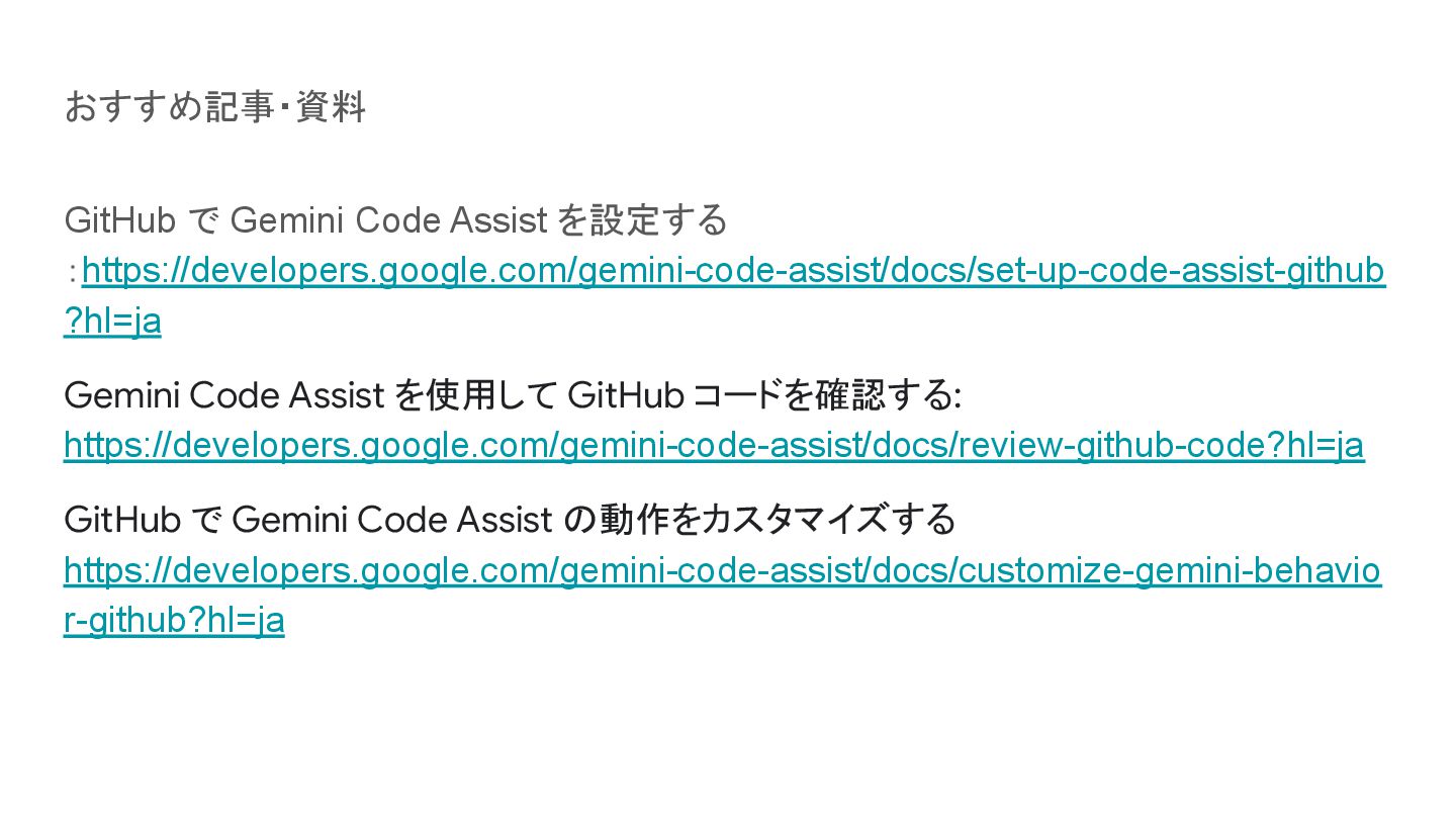 おすすめ記事・資料 GitHub で Gemini Code Assist を設定する :https://developers.google.com/gemini-code-assist/docs/set-up-code-assist-github ?hl=ja Gemini