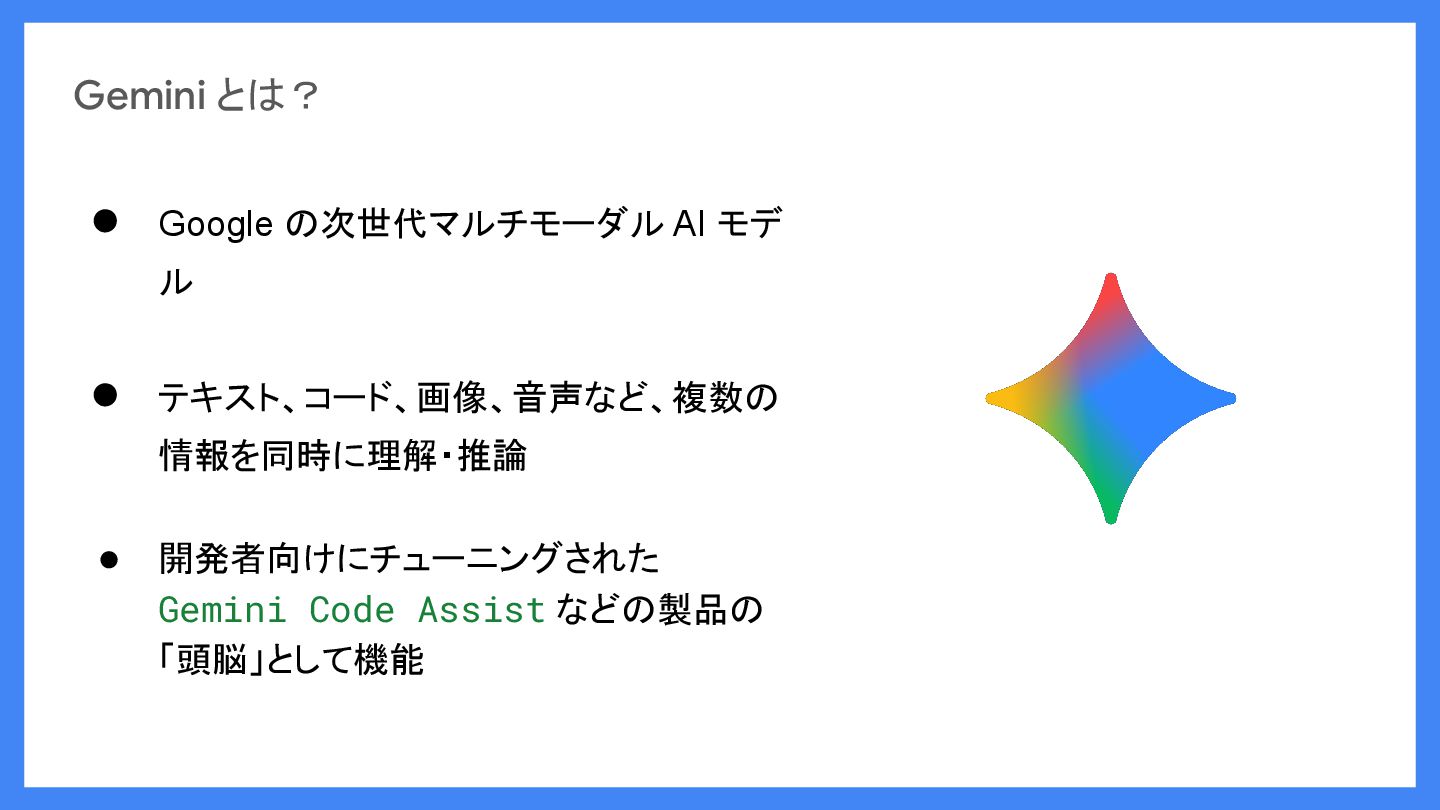 情報を同時に理解・推論 • 開発者向けにチューニングされた Gemini Code Assist などの製品の 「頭脳」として機能
