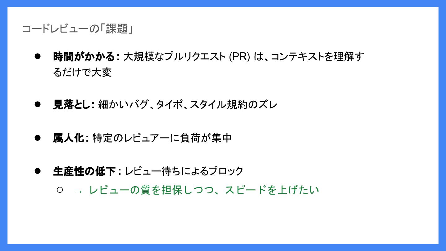 細かいバグ、タイポ、スタイル規約のズレ • 属人化: 特定のレビュアーに負荷が集中 • 生産性の低下 : レビュー待ちによるブロック ◦ → レビューの質を担保しつつ、スピードを上げたい