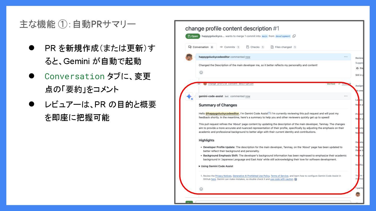 主な機能 ①:自動PRサマリー • PR を新規作成(または更新)す ると、Gemini が自動で起動 • Conversation タブに、変更