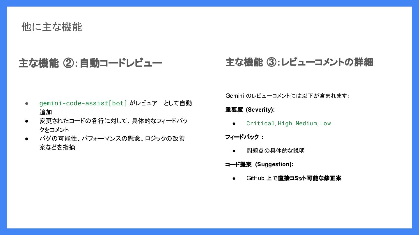 • バグの可能性、パフォーマンスの懸念、ロジックの改善 案などを指摘 主な機能 ③:レビューコメントの詳細 Gemini のレビューコメントには以下が含まれます: 重要度 (Severity): • Critical, High, Medium, Low フィードバック : • 問題点の具体的な説明 コード提案 (Suggestion): • GitHub 上で直接コミット可能な修正案