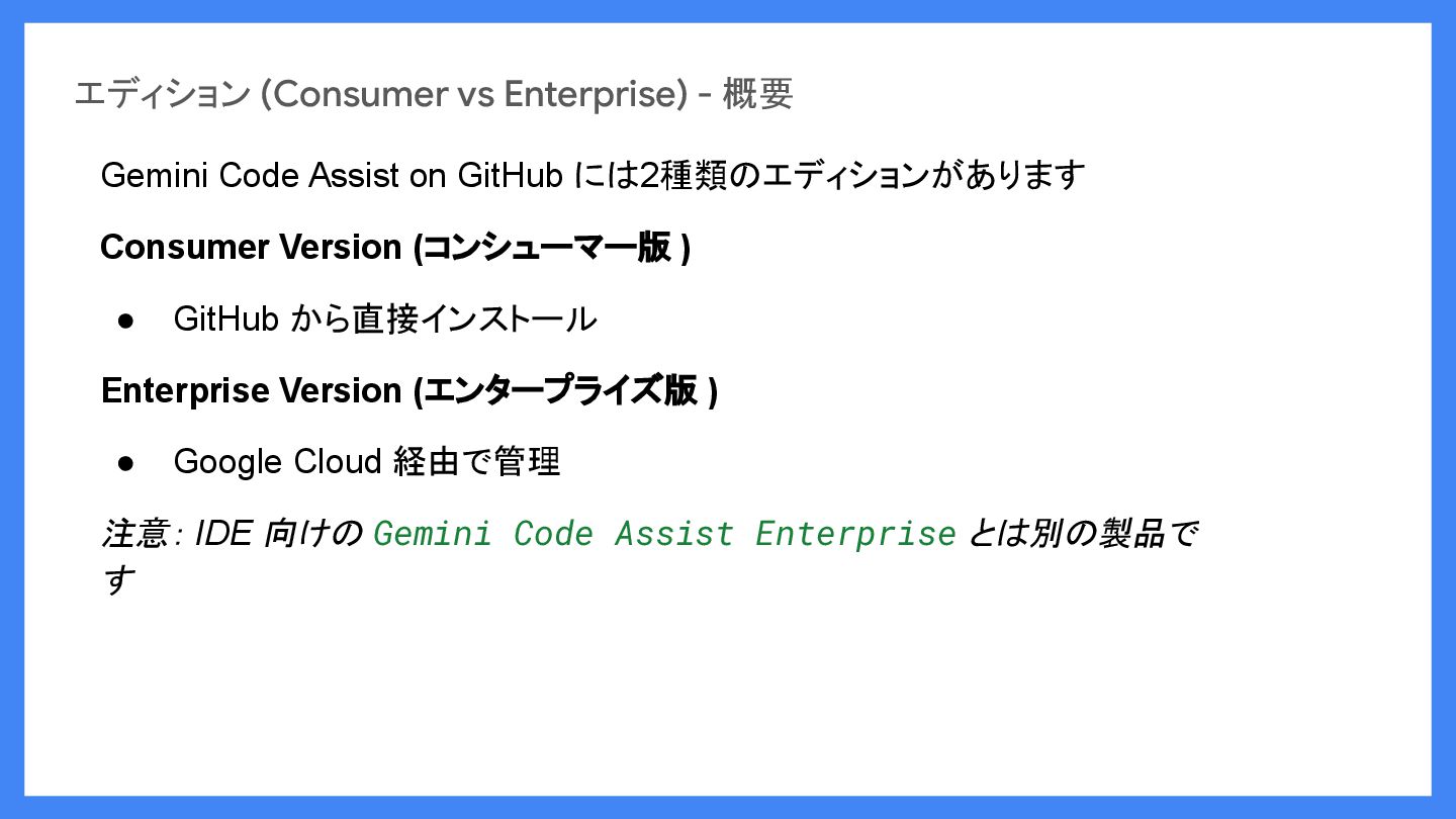 GitHub には2種類のエディションがあります Consumer Version (コンシューマー版 ) • GitHub から直接インストール Enterprise Version (エンタープライズ版 ) • Google Cloud 経由で管理 注意: IDE 向けの Gemini Code Assist Enterprise とは別の製品で す