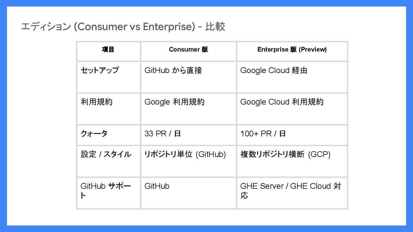 版 (Preview) セットアップ GitHub から直接 Google Cloud 経由 利用規約 Google 利用規約 Google Cloud 利用規約 クォータ 33 PR / 日 100+ PR / 日 設定 / スタイル リポジトリ単位 (GitHub) 複数リポジトリ横断 (GCP) GitHub サポー ト GitHub GHE Server / GHE Cloud 対 応