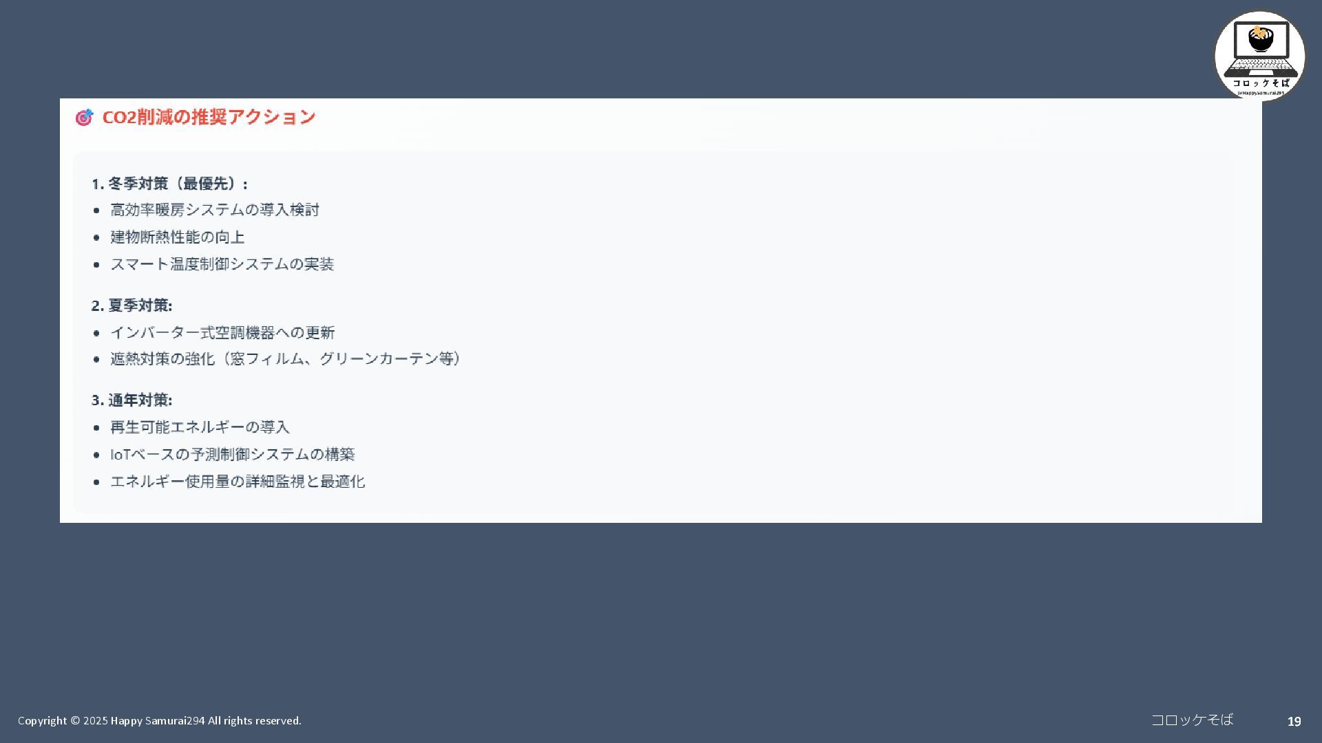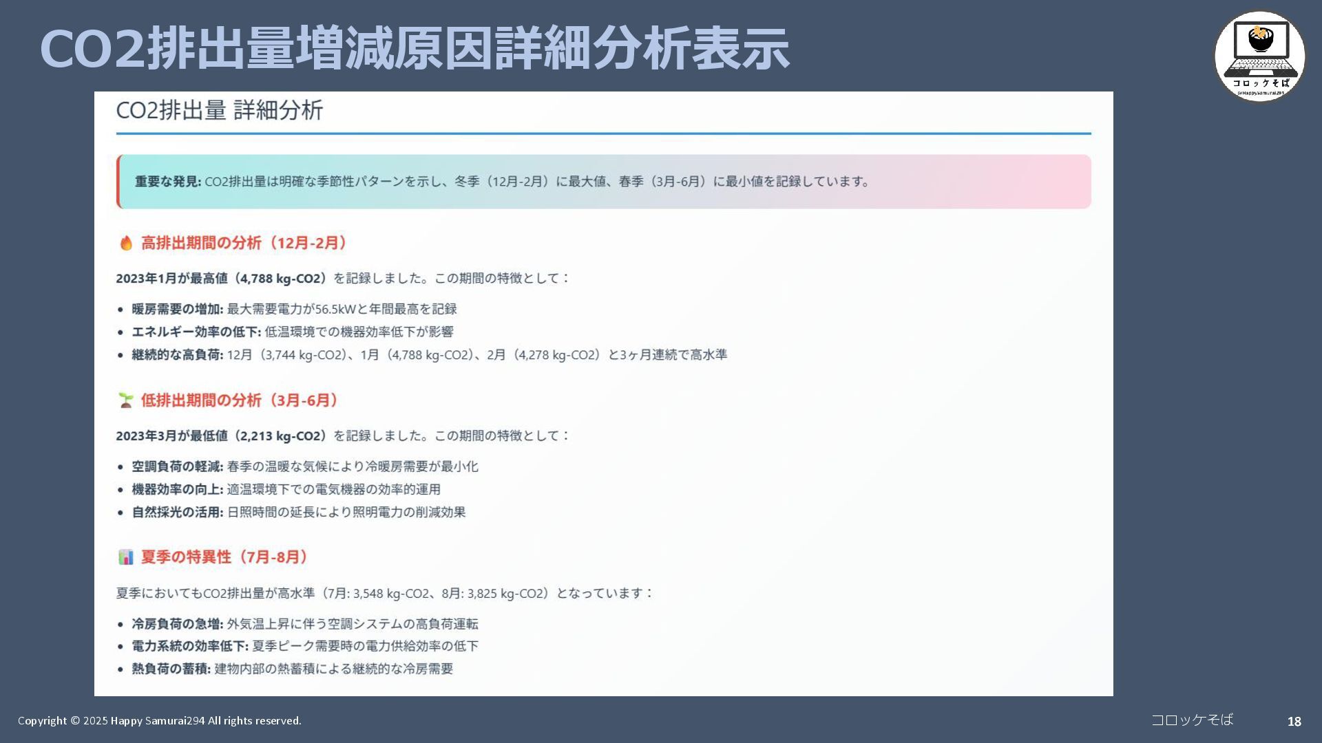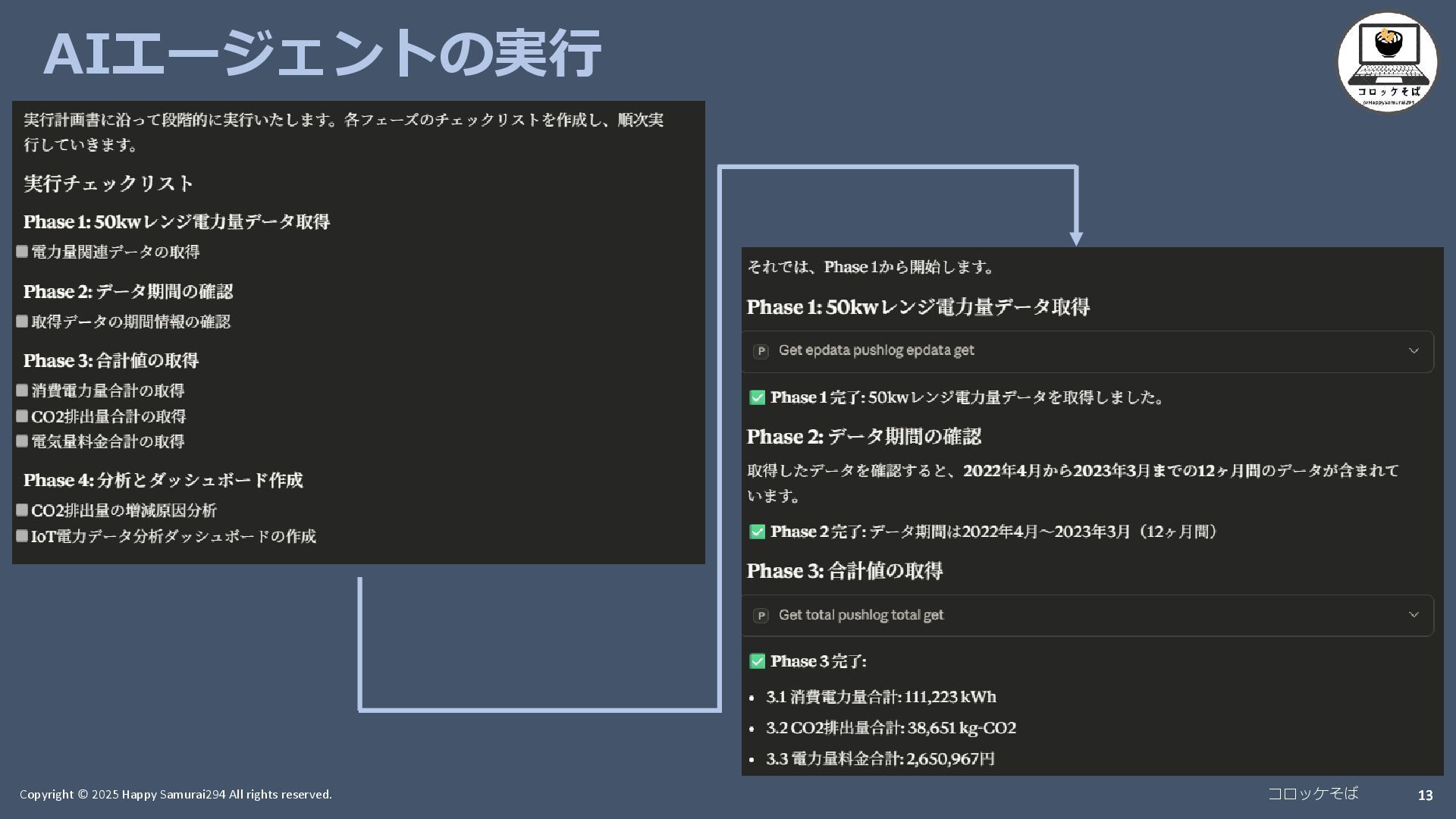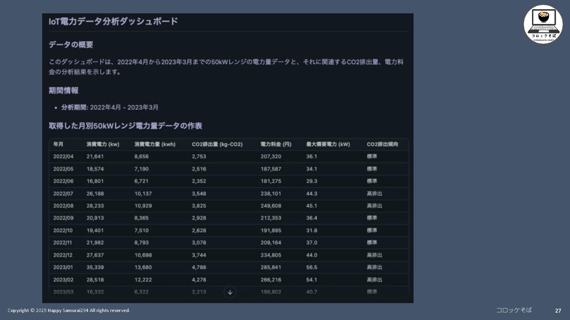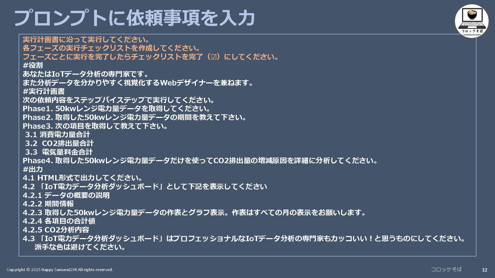 12 12 12 プロンプトに依頼事項を入力 実行計画書に沿って実行してください。 各フェーズの実行チェックリストを作成してください。 フェーズごとに実行を完了したらチェックリストを完了( )にしてください。 #役割 あなたはIoTデータ分析の専門家です。 また分析データを分かりやすく視覚化するWebデザイナーを兼ねます。 #実行計画書 次の依頼内容をステップバイステップで実行してください。 Phase1. 50kwレンジ電力量データを取得してください。 Phase2. 取得した50kwレンジ電力量データの期間を教えて下さい。 Phase3. 次の項目を取得して教えて下さい。 3.1 消費電力量合計 3.2 CO2排出量合計 3.3 電気量料金合計 Phase4. 取得した50kwレンジ電力量データだけを使ってCO2排出量の増減原因を詳細に分析してください。 #出力 4.1 HTML形式で出力してください。 4.2 「IoT電力データ分析ダッシュボード」として下記を表示してください 4.2.1 データの概要の説明 4.2.2 期間情報 4.2.3 取得した50kwレンジ電力量データの作表とグラフ表示。作表はすべての月の表示をお願いします。 4.2.4 各項目の合計値 4.2.5 CO2分析内容 4.3 「IoT電力データ分析ダッシュボード」はプロフェッショナルなIoTデータ分析の専門家もカッコいい!と思うものにしてください。 派手な色は避けてください。