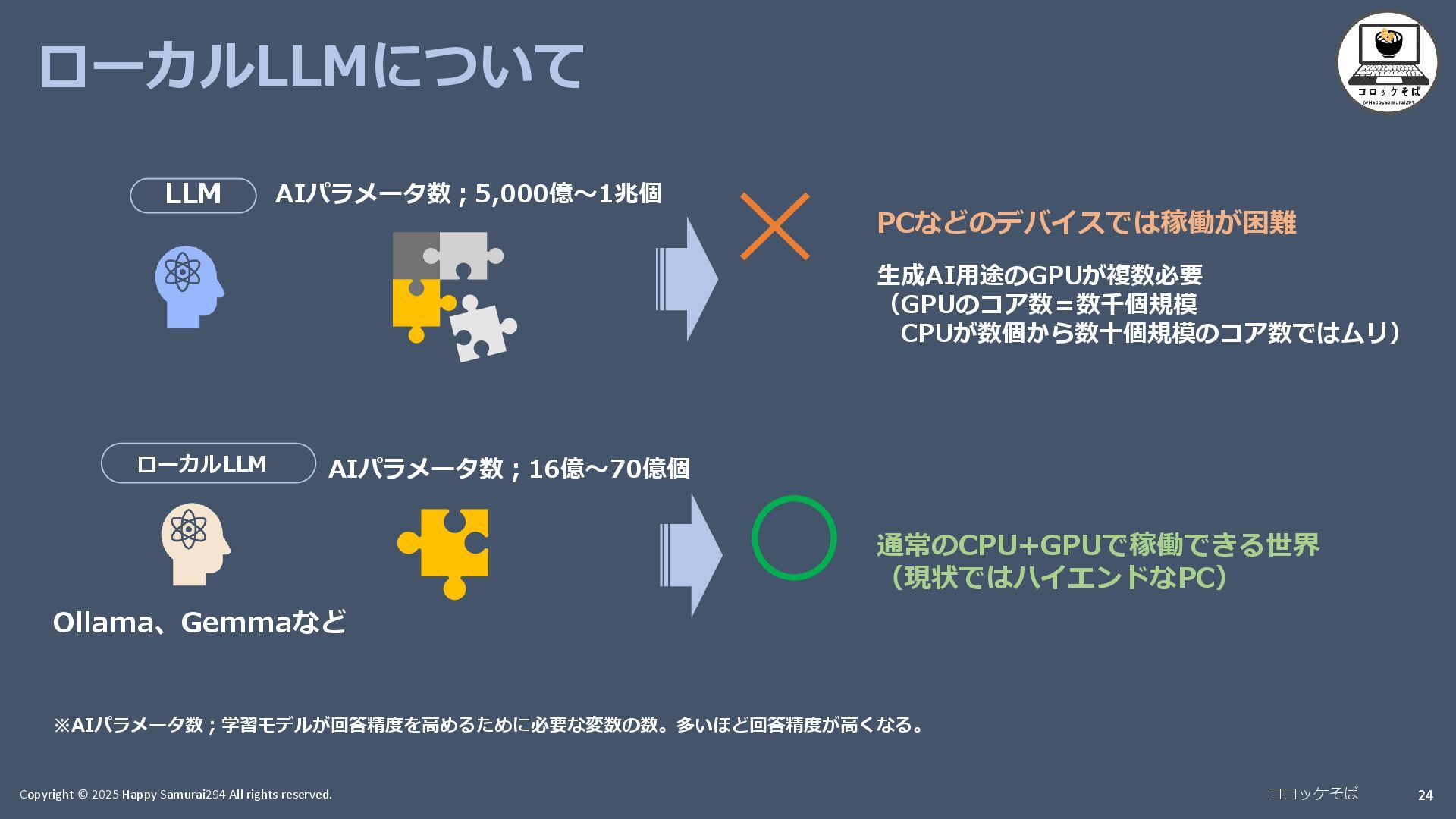 24 24 24 ローカルLLMについて LLM ローカルLLM Ollama、Gemmaなど 生成AI用途のGPUが複数必要 (GPUのコア数=数千個規模 CPUが数個から数十個規模のコア数ではムリ) 通常のCPU+GPUで稼働できる世界 (現状ではハイエンドなPC) AIパラメータ数;16億~70億個 AIパラメータ数;5,000億~1兆個 ※AIパラメータ数;学習モデルが回答精度を高めるために必要な変数の数。多いほど回答精度が高くなる。 PCなどのデバイスでは稼働が困難