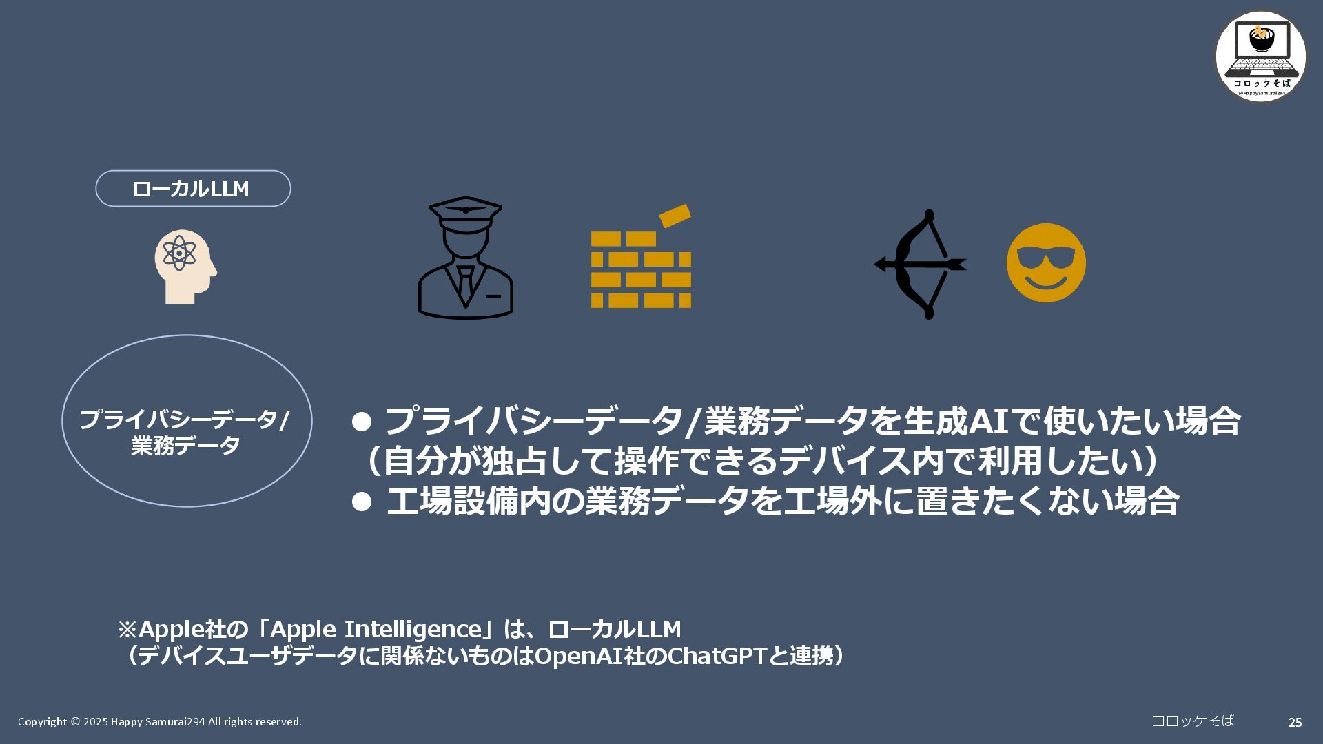 25 25 25 プライバシーデータ/ 業務データ ⚫ プライバシーデータ/業務データを生成AIで使いたい場合 (自分が独占して操作できるデバイス内で利用したい) ⚫ 工場設備内の業務データを工場外に置きたくない場合 ※Apple社の「Apple Intelligence」は、ローカルLLM (デバイスユーザデータに関係ないものはOpenAI社のChatGPTと連携) ローカルLLM