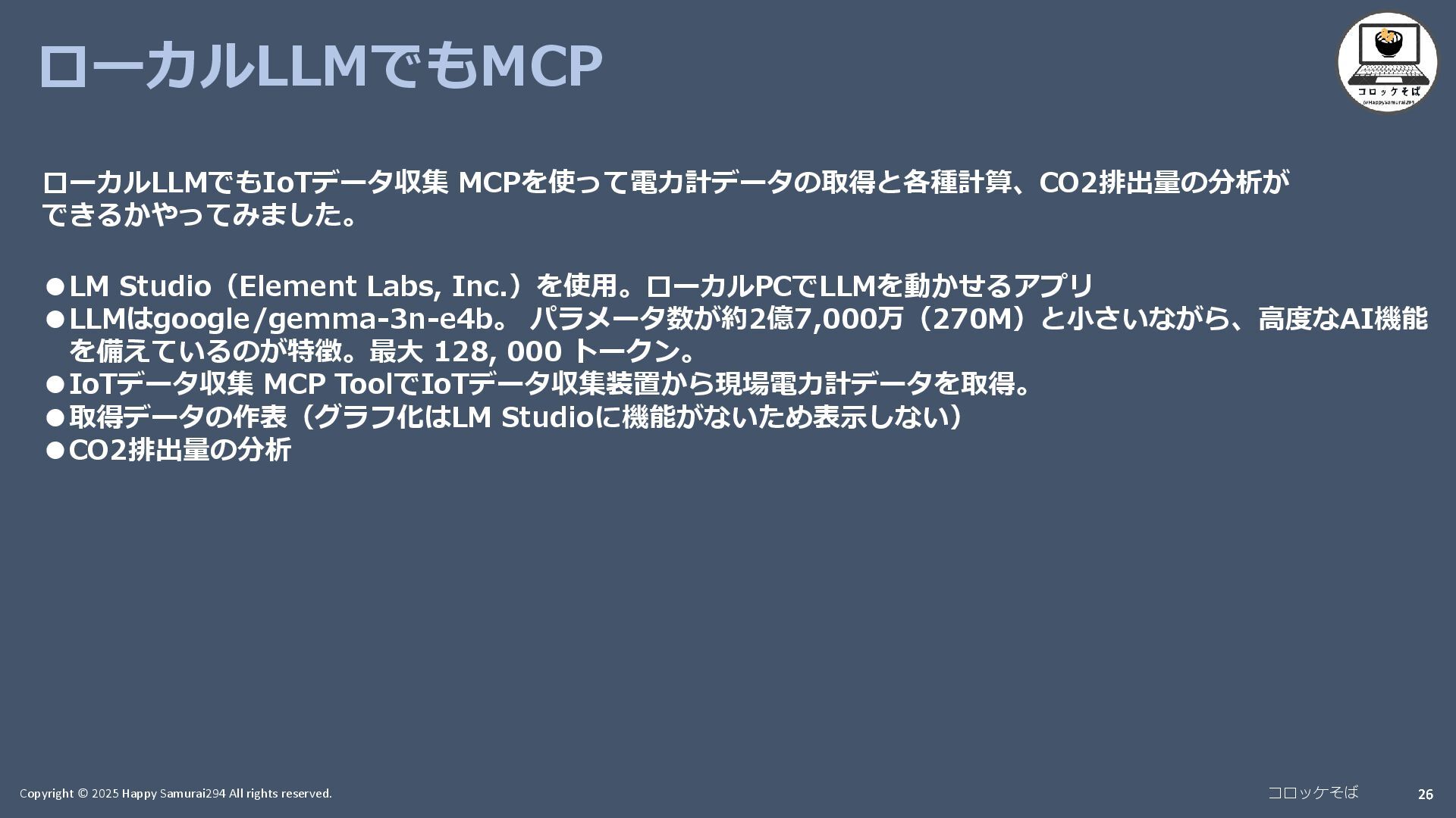 26 26 26 ローカルLLMでもMCP ローカルLLMでもIoTデータ収集 MCPを使って電力計データの取得と各種計算、CO2排出量の分析が できるかやってみました。 •LM Studio(Element Labs, Inc.)を使用。ローカルPCでLLMを動かせるアプリ •LLMはgoogle/gemma-3n-e4b。 パラメータ数が約2億7,000万(270M)と小さいながら、高度なAI機能 を備えているのが特徴。最大 128, 000 トークン。 •IoTデータ収集 MCP ToolでIoTデータ収集装置から現場電力計データを取得。 •取得データの作表(グラフ化はLM Studioに機能がないため表示しない) •CO2排出量の分析
