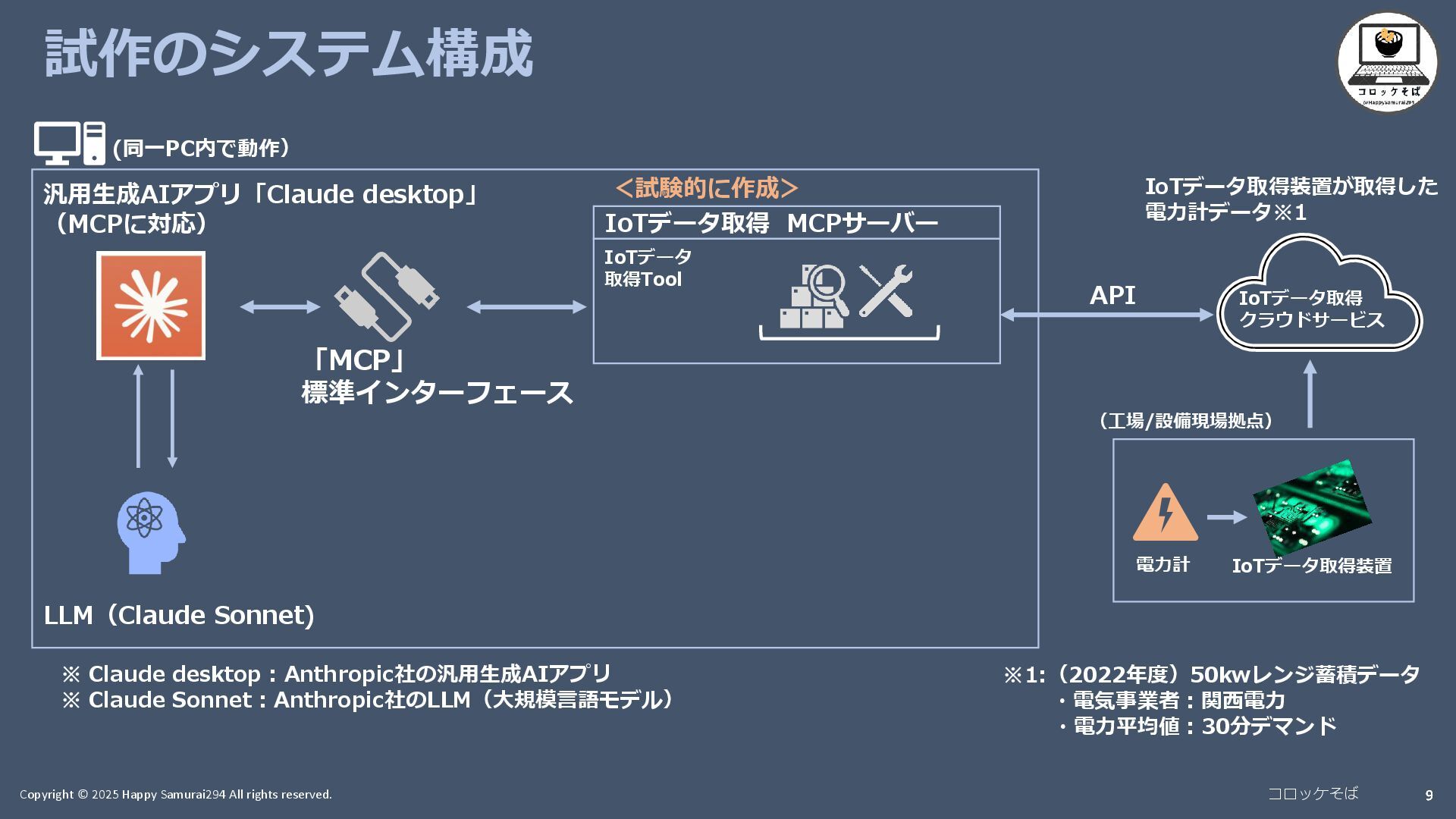 8 8 8 MCPを試作してみた ※2:関西電力の単価/計算式/CO2排出係数を使用 (題材)「電力計データを収集して生成AIで分析」 ➢ IoTデータ収集装置から電力計データを収集※1 ➢ 消費電力量合計、CO2排出量合計、 電気量料金合計の各計算※2 ➢ 各データの可視化(作表、グラフ化) ➢ CO2排出量の増減原因の推測 『役割分担』 ※生成AIは数学的な計算が弱い。計算は、MCPサーバーのような外部ツールに任せるのが確実。 これが生成AIを賢く使いこなすコツ ※1:50kwレンジ蓄積データ ◆IoTデータ収集 MCPサーバ(試作) ◆生成AI