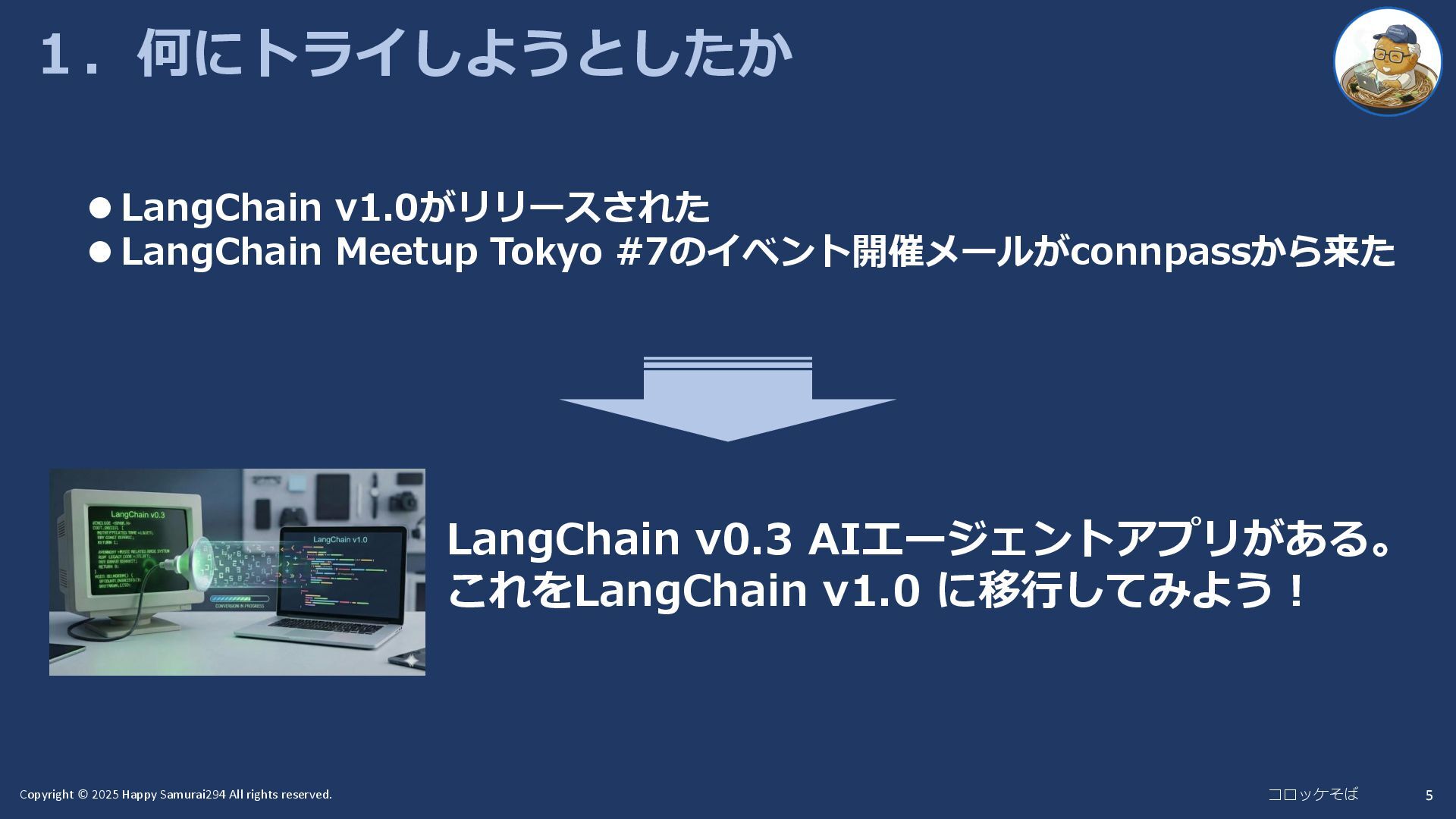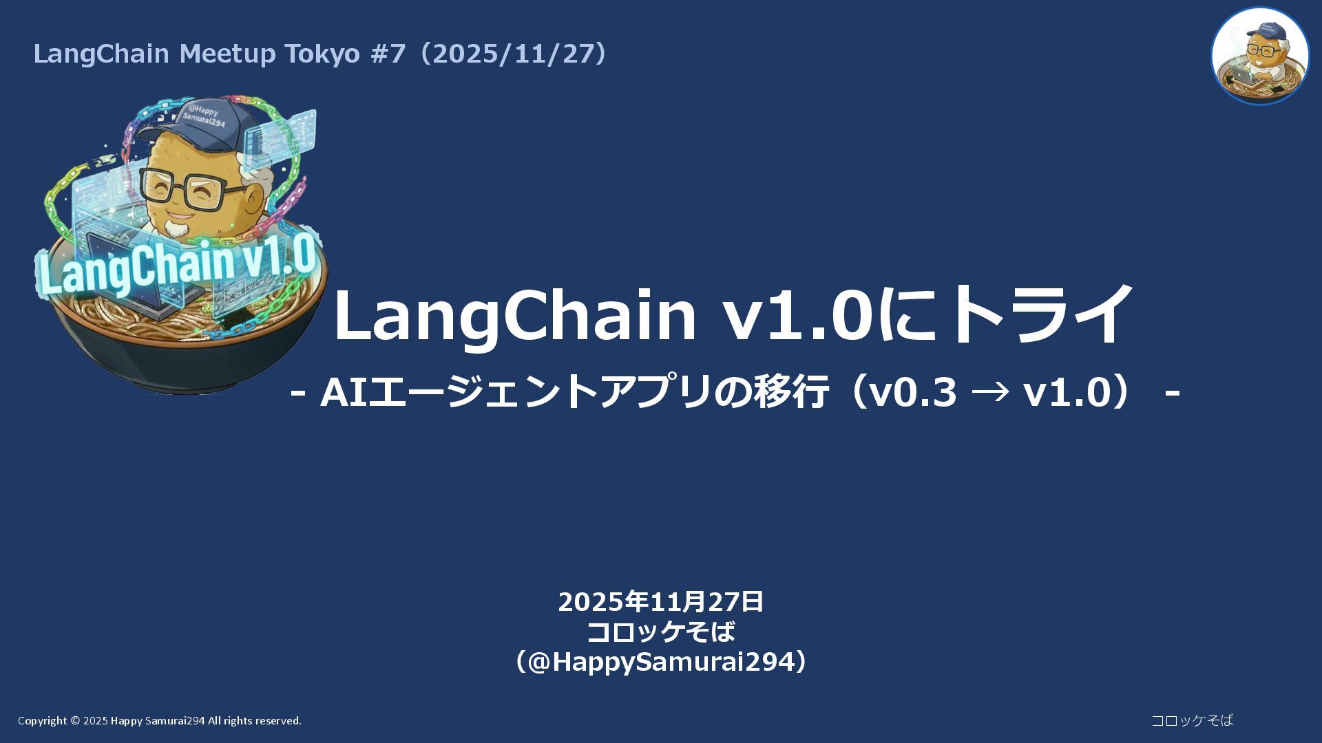 コロッケそば (@HappySamurai294) LangChain v1.0にトライ - AIエージェントアプリの移行(v0.3 → v1.0) - LangChain Meetup Tokyo #7(2025/11/27)