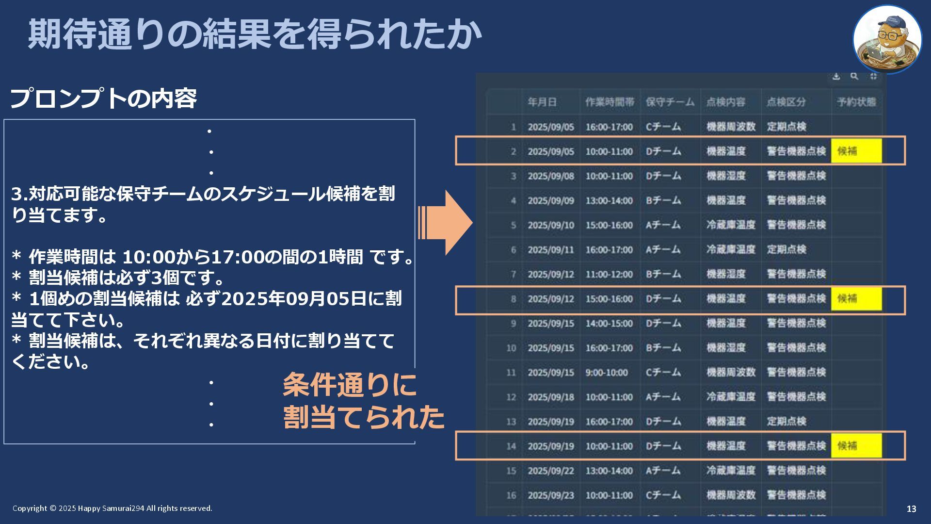 13 13 期待通りの結果を得られたか 13 プロンプトの内容 ・ ・ ・ 3.対応可能な保守チームのスケジュール候補を割 り当てます。 * 作業時間は 10:00から17:00の間の1時間 です。 * 割当候補は必ず3個です。 * 1個めの割当候補は 必ず2025年09月05日に割 当てて下さい。 * 割当候補は、それぞれ異なる日付に割り当てて ください。 ・ ・ ・ 条件通りに 割当てられた