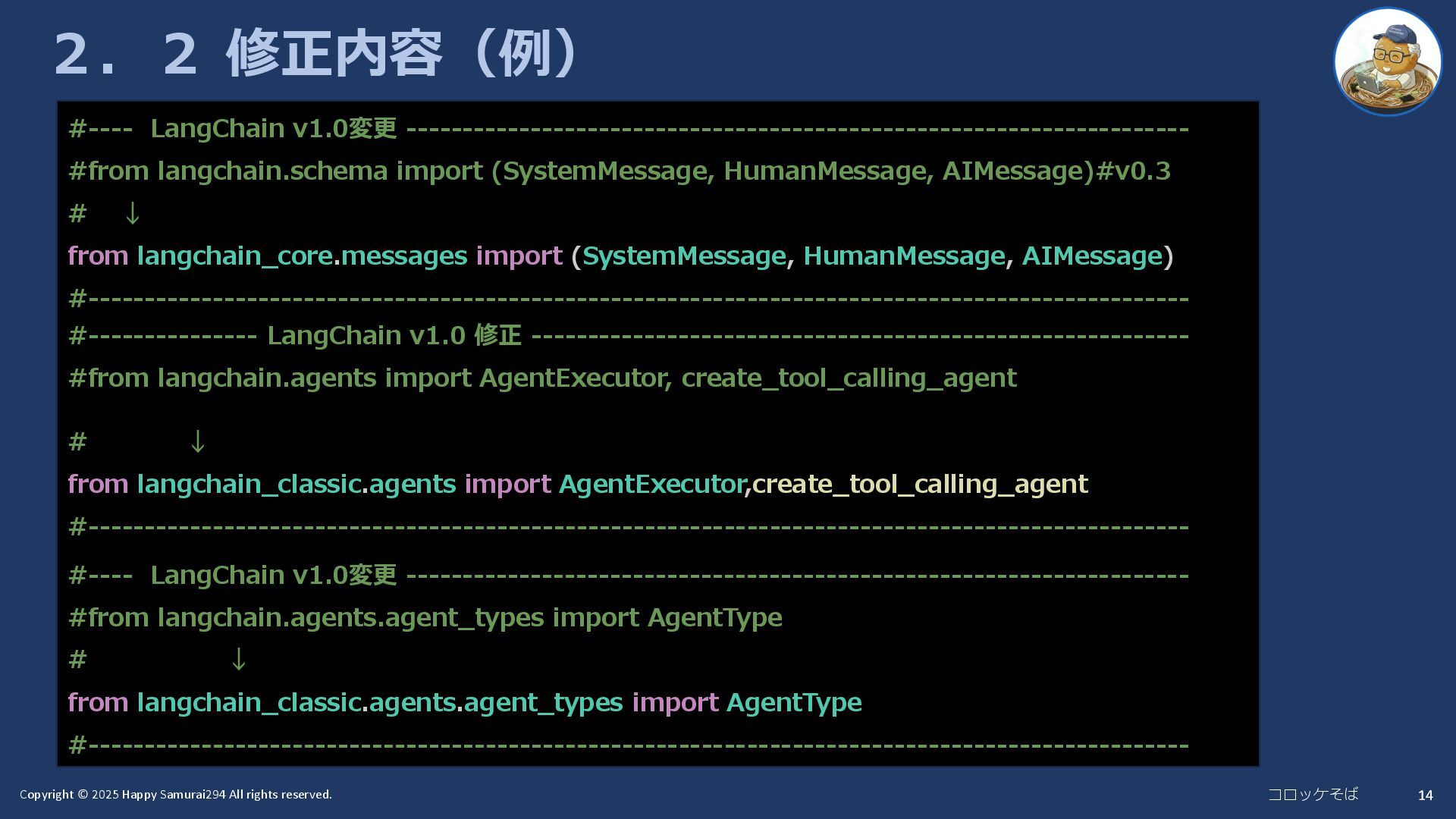 14 2.2 修正内容(例) #---- LangChain v1.0変更 --------------------------------------------------------------------- #from langchain.agents.agent_types import AgentType # ↓ from langchain_classic.agents.agent_types import AgentType #------------------------------------------------------------------------------------------------- #---- LangChain v1.0変更 --------------------------------------------------------------------- #from langchain.schema import (SystemMessage, HumanMessage, AIMessage)#v0.3 # ↓ from langchain_core.messages import (SystemMessage, HumanMessage, AIMessage) #------------------------------------------------------------------------------------------------- #--------------- LangChain v1.0 修正 ---------------------------------------------------------- #from langchain.agents import AgentExecutor, create_tool_calling_agent # ↓ from langchain_classic.agents import AgentExecutor,create_tool_calling_agent #-------------------------------------------------------------------------------------------------