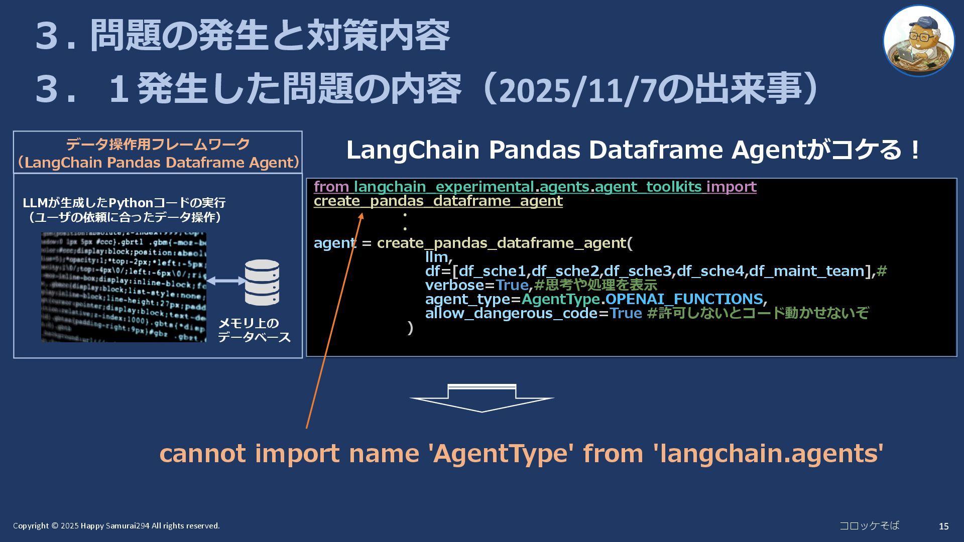 15 3. 問題の発生と対策内容 3.1発生した問題の内容(2025/11/7の出来事) データ操作用フレームワーク メモリ上の データベース LLMが生成したPythonコードの実行 (ユーザの依頼に合ったデータ操作) (LangChain Pandas Dataframe Agent) LangChain Pandas Dataframe Agentがコケる! from langchain_experimental.agents.agent_toolkits import create_pandas_dataframe_agent ・ ・ agent = create_pandas_dataframe_agent( llm, df=[df_sche1,df_sche2,df_sche3,df_sche4,df_maint_team],# verbose=True,#思考や処理を表示 agent_type=AgentType.OPENAI_FUNCTIONS, allow_dangerous_code=True #許可しないとコード動かせないぞ ) cannot import name 'AgentType' from 'langchain.agents'