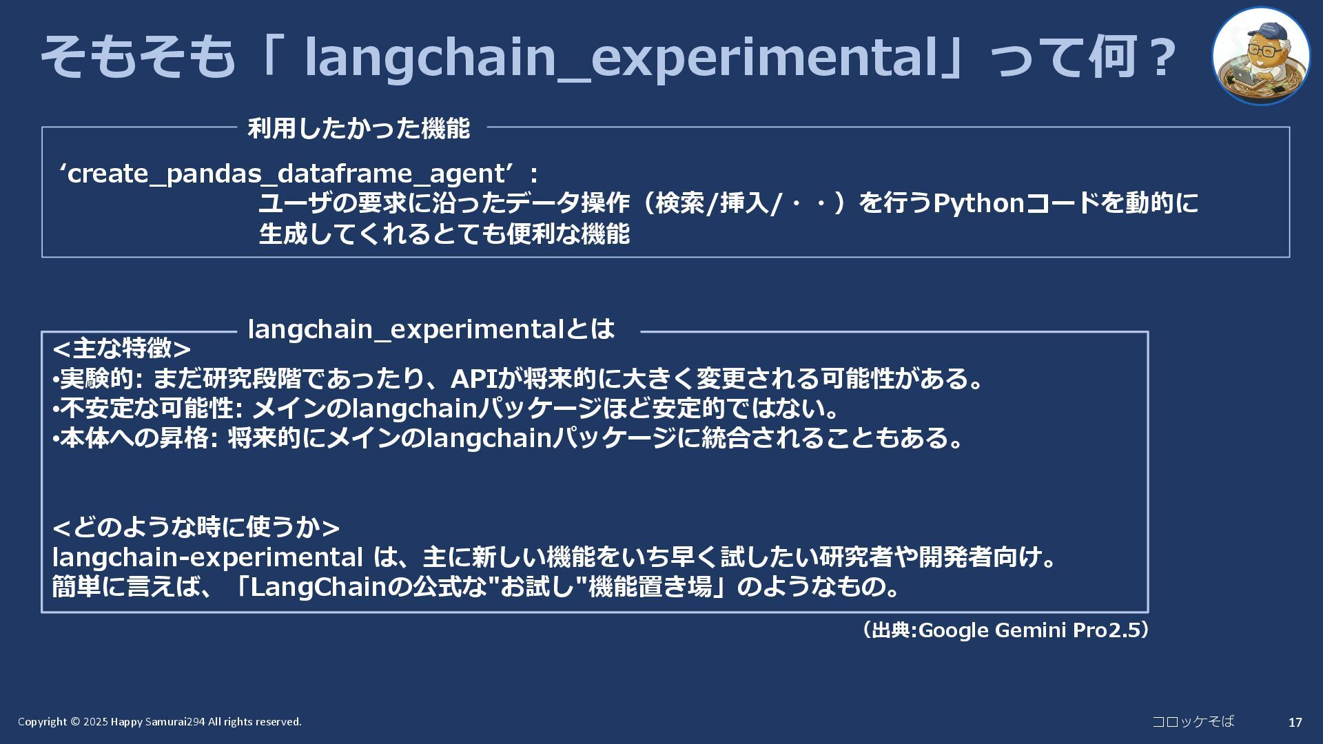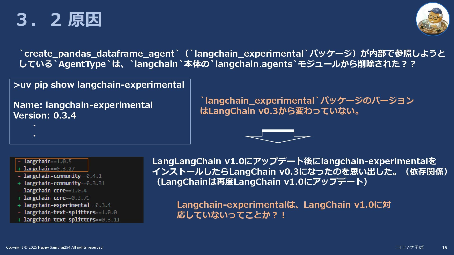 16 3.2 原因 `create_pandas_dataframe_agent`(`langchain_experimental`パッケージ)が内部で参照しようと している`AgentType`は、`langchain`本体の`langchain.agents`モジュールから削除された?? >uv pip show langchain-experimental Name: langchain-experimental Version: 0.3.4 ・ ・ `langchain_experimental`パッケージのバージョン はLangChain v0.3から変わっていない。 Langchain-experimentalは、LangChain v1.0に対 応していないってことか?! LangLangChain v1.0にアップデート後にlangchain-experimentalを インストールしたらLangChain v0.3になったのを思い出した。(依存関係) (LangChainは再度LangChain v1.0にアップデート)