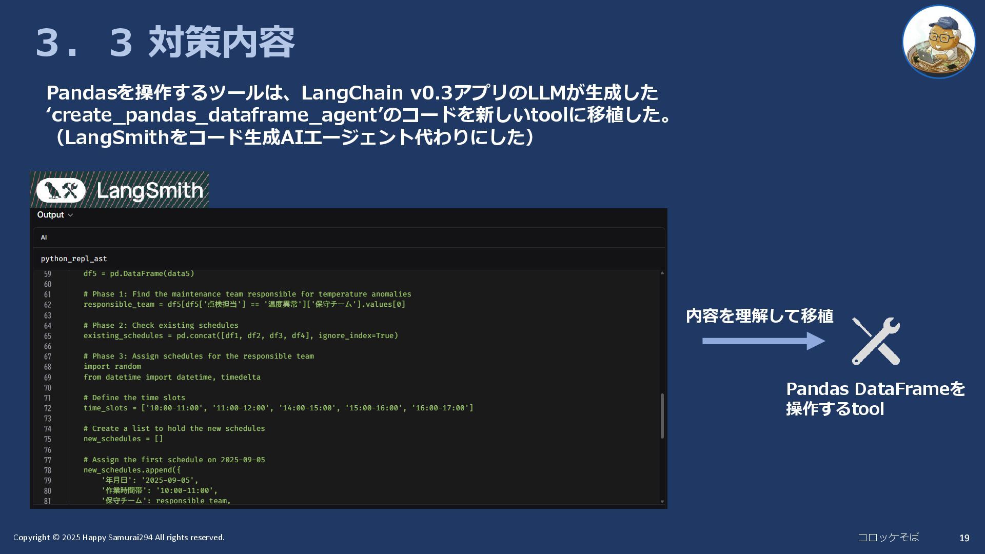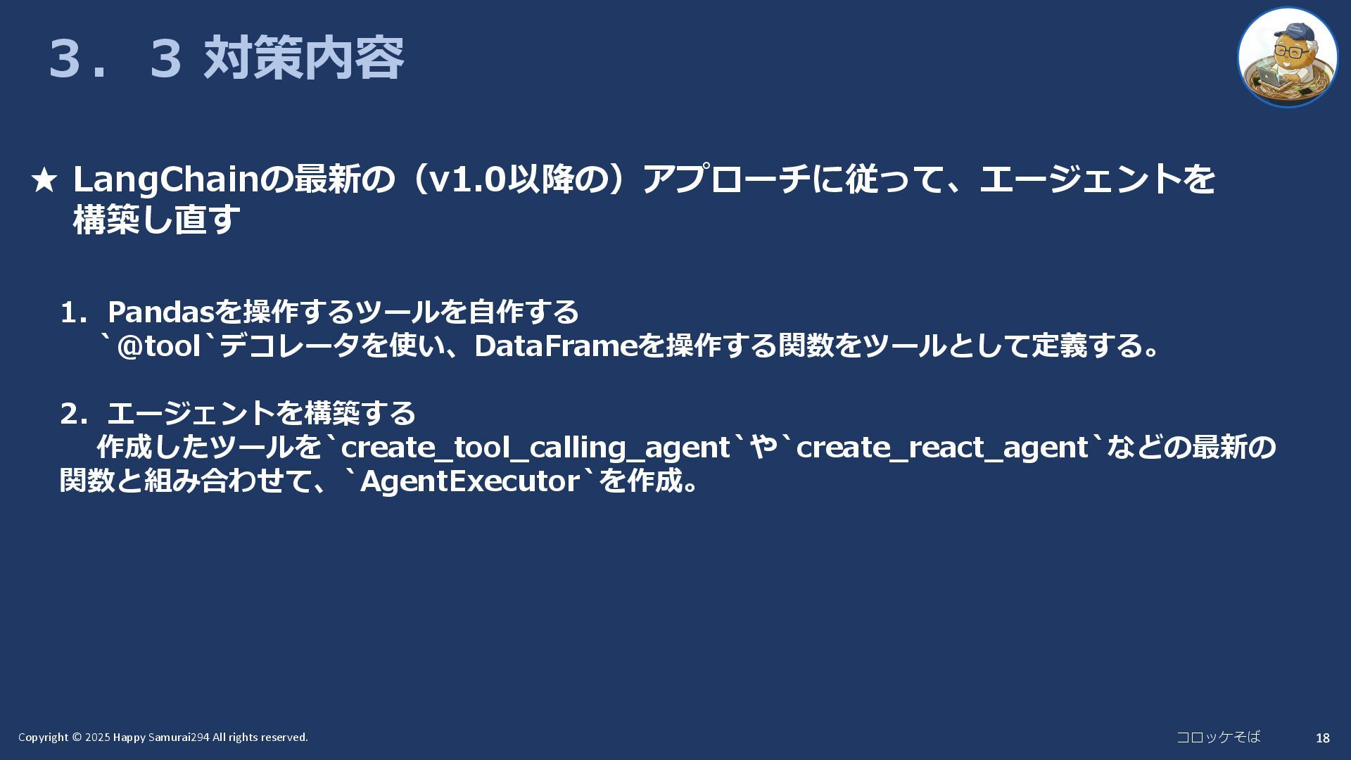 18 3.3 対策内容 ★ LangChainの最新の(v1.0以降の)アプローチに従って、エージェントを 構築し直す 1. Pandasを操作するツールを自作する `@tool`デコレータを使い、DataFrameを操作する関数をツールとして定義する。 2. エージェントを構築する 作成したツールを`create_tool_calling_agent`や`create_react_agent`などの最新の 関数と組み合わせて、`AgentExecutor`を作成。