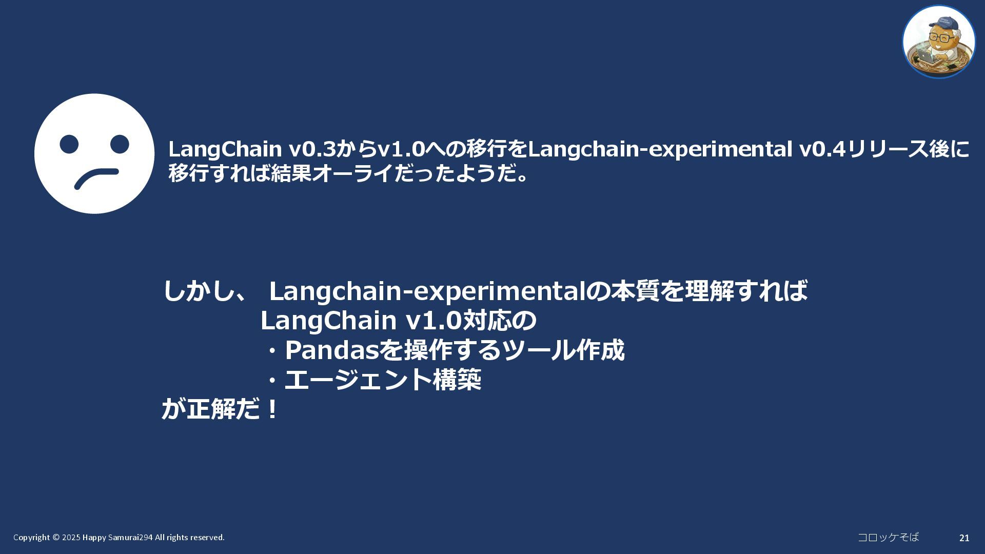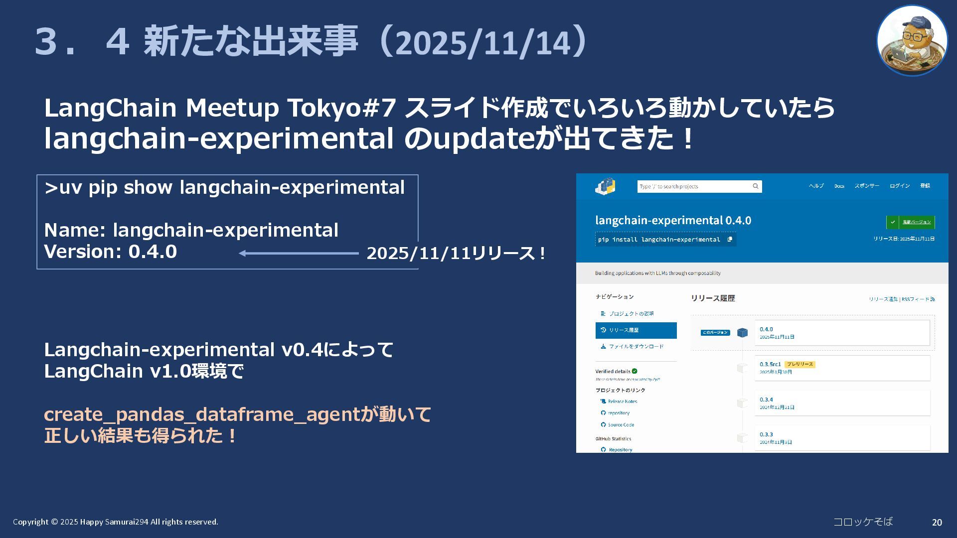 20 3.4 新たな出来事(2025/11/14) >uv pip show langchain-experimental Name: langchain-experimental Version: 0.4.0 LangChain Meetup Tokyo#7 スライド作成でいろいろ動かしていたら langchain-experimental のupdateが出てきた! Langchain-experimental v0.4によって LangChain v1.0環境で create_pandas_dataframe_agentが動いて 正しい結果も得られた! 2025/11/11リリース!