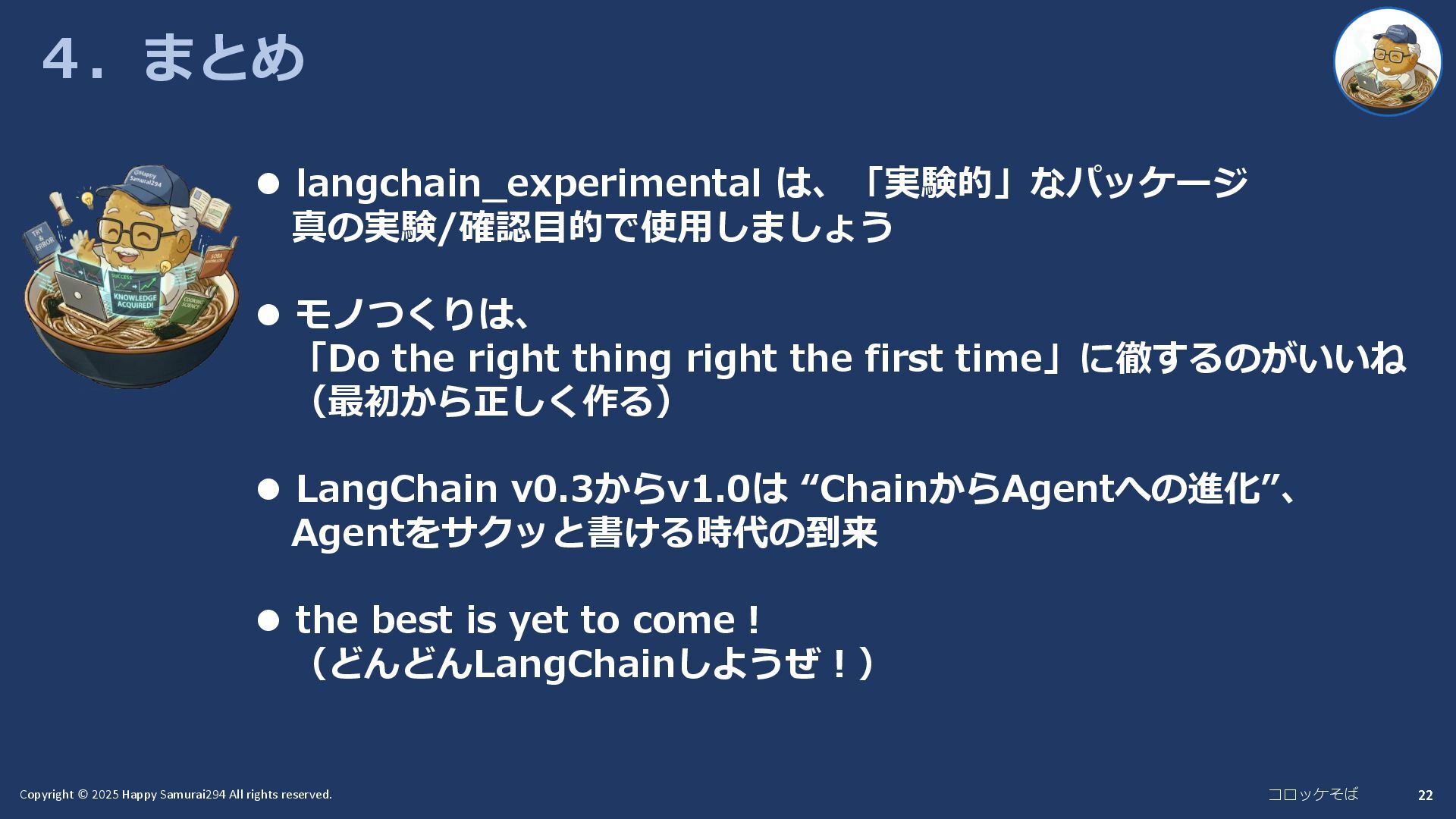 22 22 22 4.まとめ ⚫ langchain_experimental は、「実験的」なパッケージ 真の実験/確認目的で使用しましょう ⚫ モノつくりは、 「Do the right thing right the first time」に徹するのがいいね (最初から正しく作る) ⚫ LangChain v0.3からv1.0は “ChainからAgentへの進化”、 Agentをサクッと書ける時代の到来 ⚫ the best is yet to come! (どんどんLangChainしようぜ!)