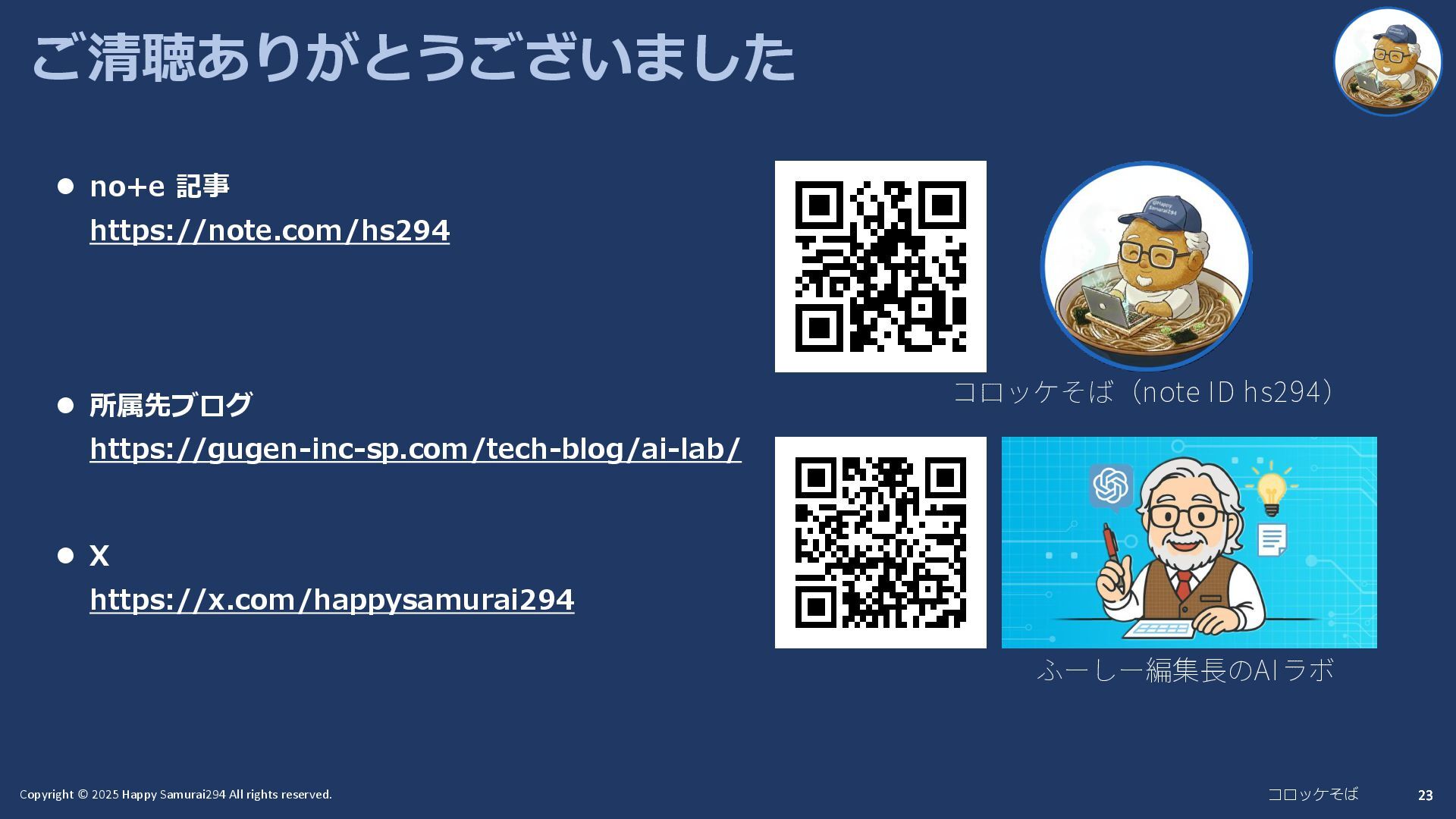 23 23 23 ご清聴ありがとうございました ⚫ no+e 記事 https://note.com/hs294 ⚫ 所属先ブログ https://gugen-inc-sp.com/tech-blog/ai-lab/ ⚫ X https://x.com/happysamurai294 ふーしー編集長のAIラボ コロッケそば(note ID hs294)