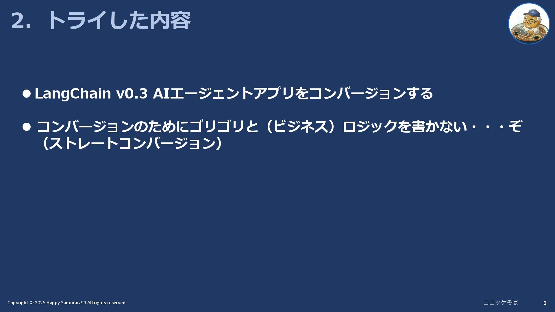 2.トライした内容 6 ⚫ LangChain v0.3 AIエージェントアプリをコンバージョンする ⚫ コンバージョンのためにゴリゴリと(ビジネス)ロジックを書かない・・・ぞ (ストレートコンバージョン)