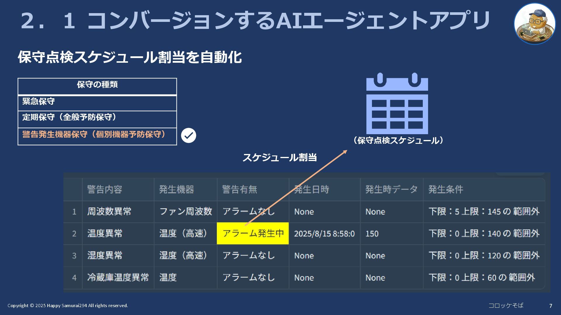7 2.1 コンバージョンするAIエージェントアプリ 保守の種類 緊急保守 定期保守(全般予防保守) 警告発生機器保守(個別機器予防保守) (保守点検スケジュール) スケジュール割当 保守点検スケジュール割当を自動化